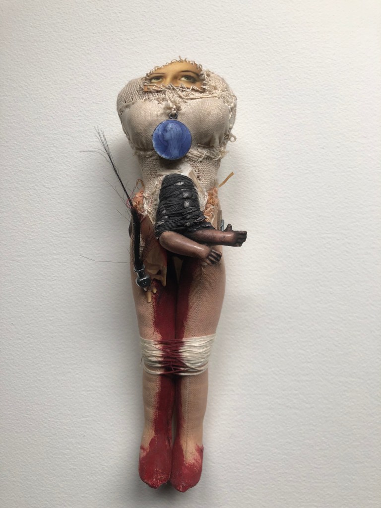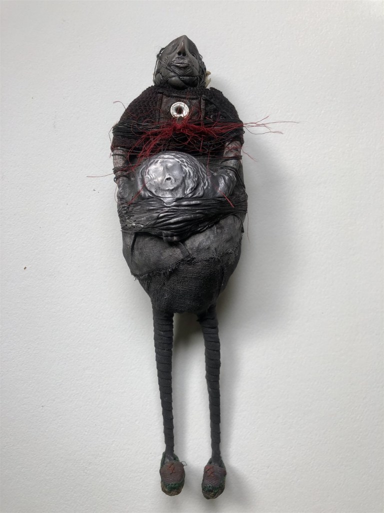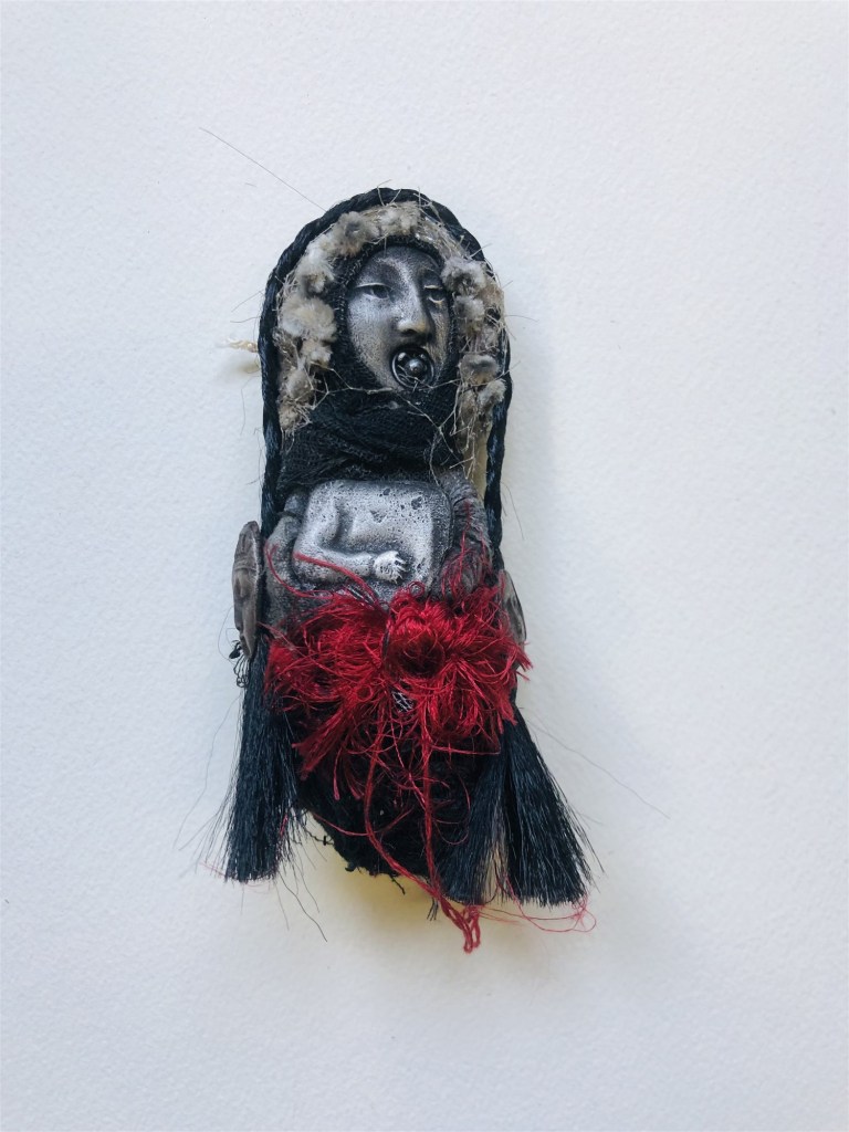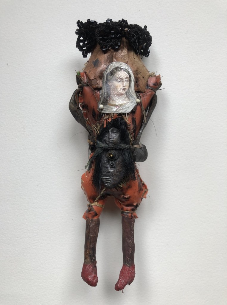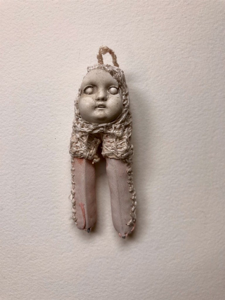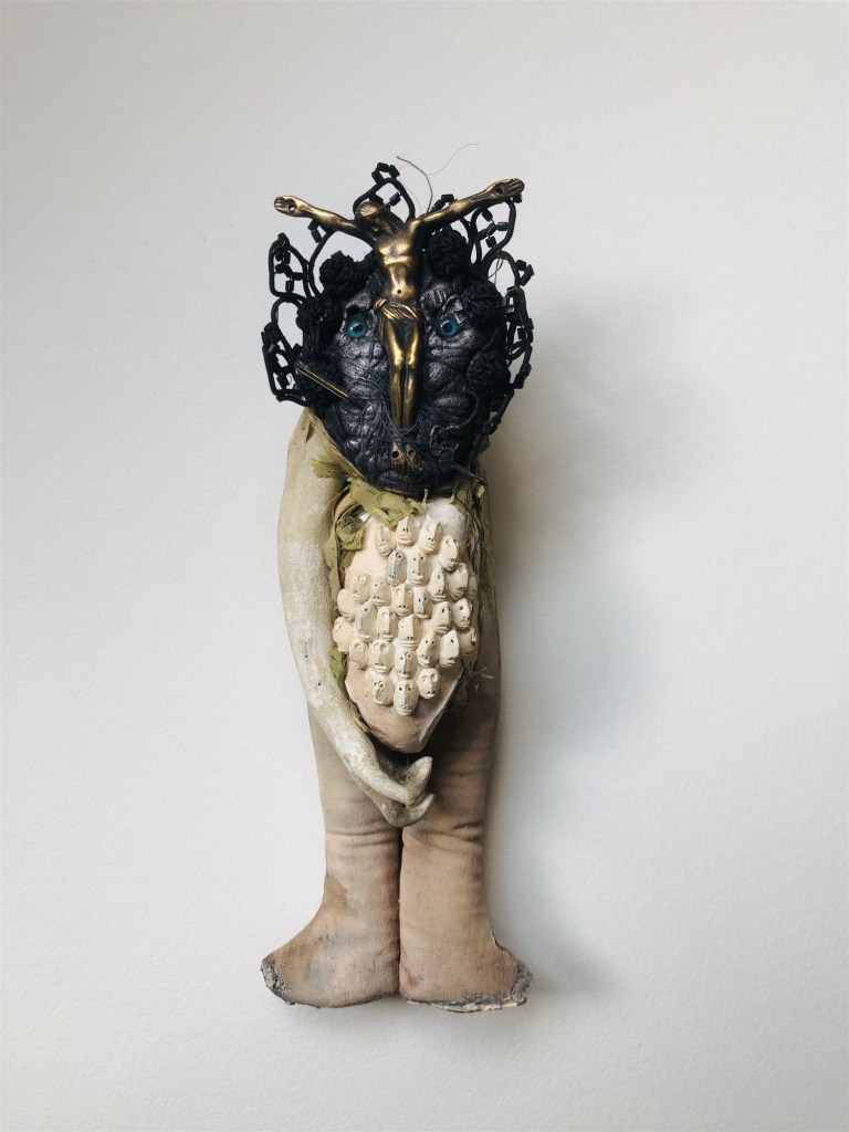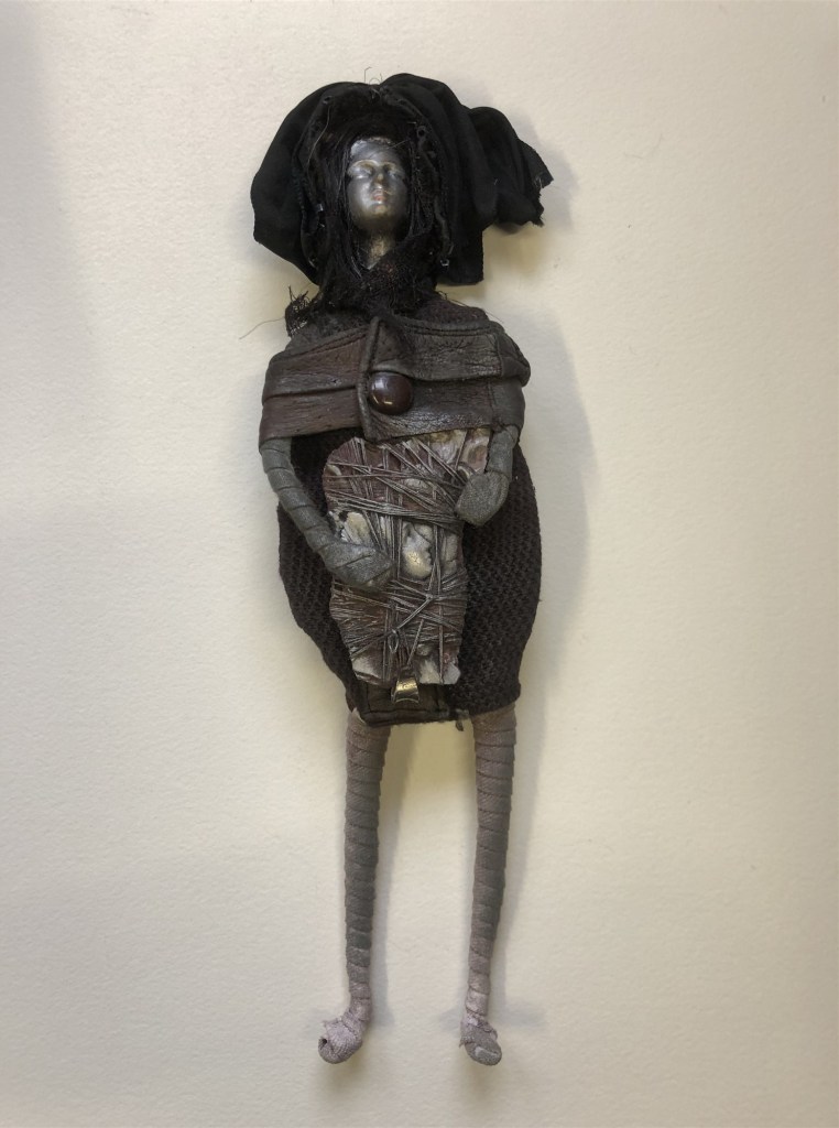 POUPÉE N°317 – Tissus – Broderie – Céramique – Cuir. 11 cm X 5 cm.