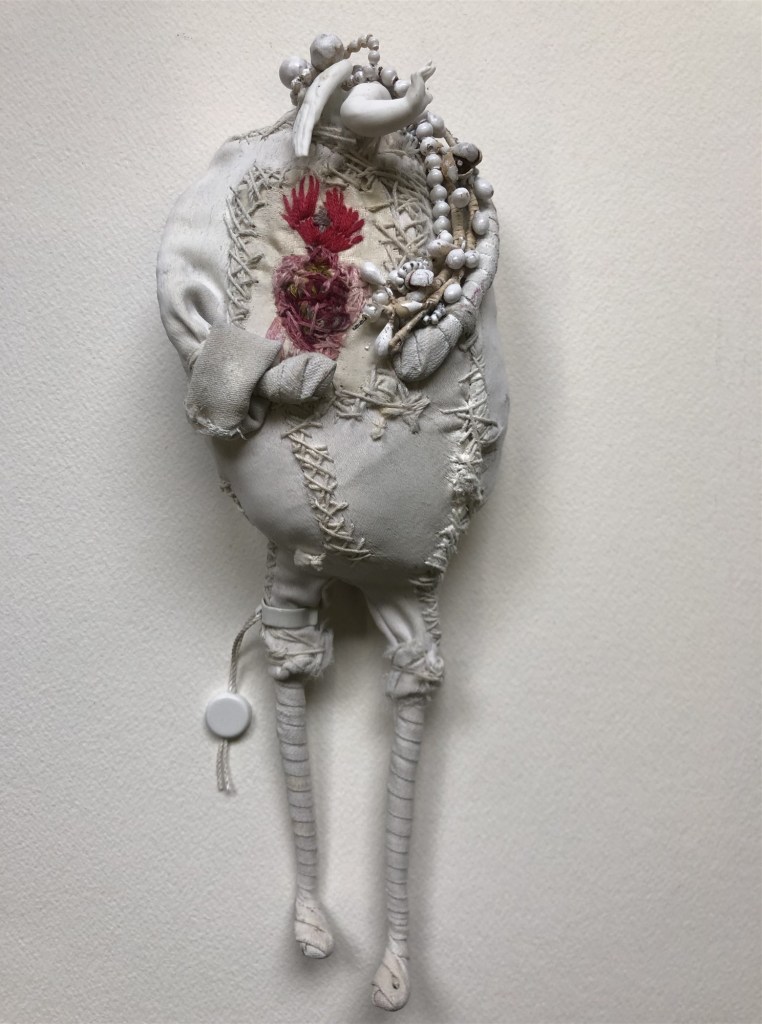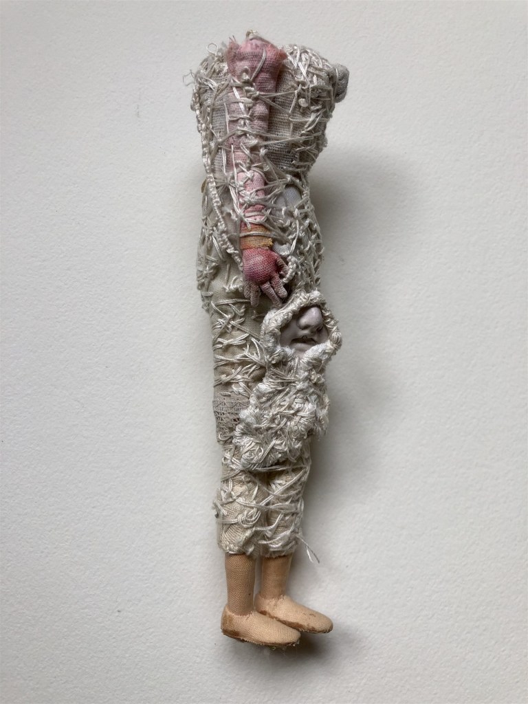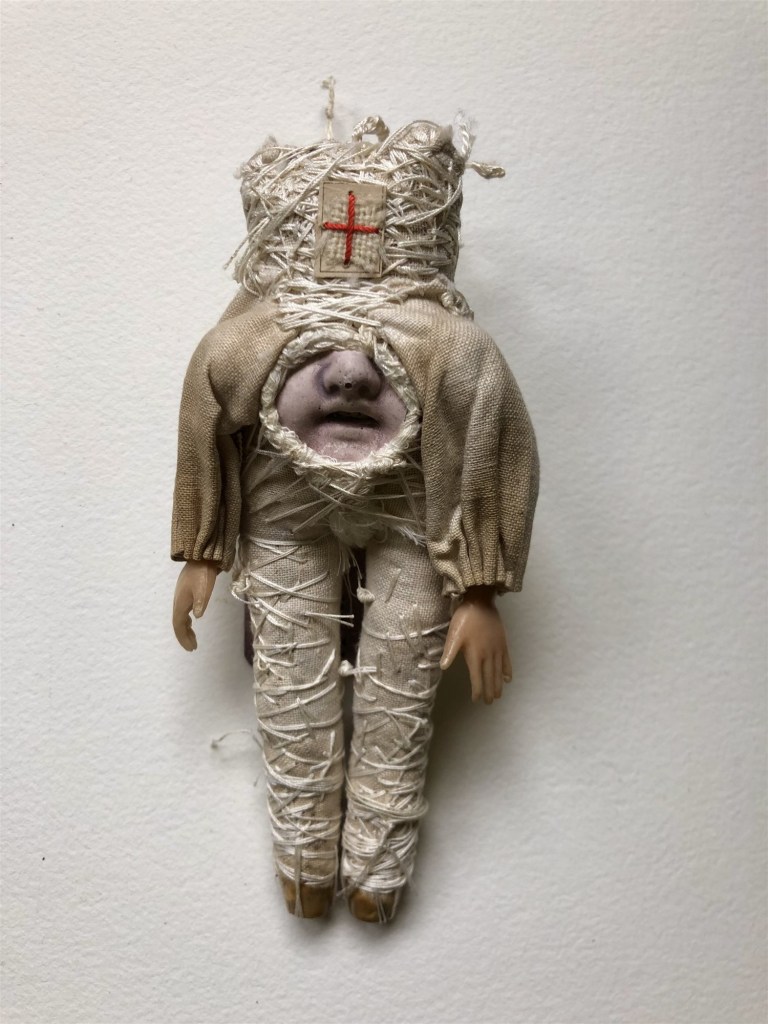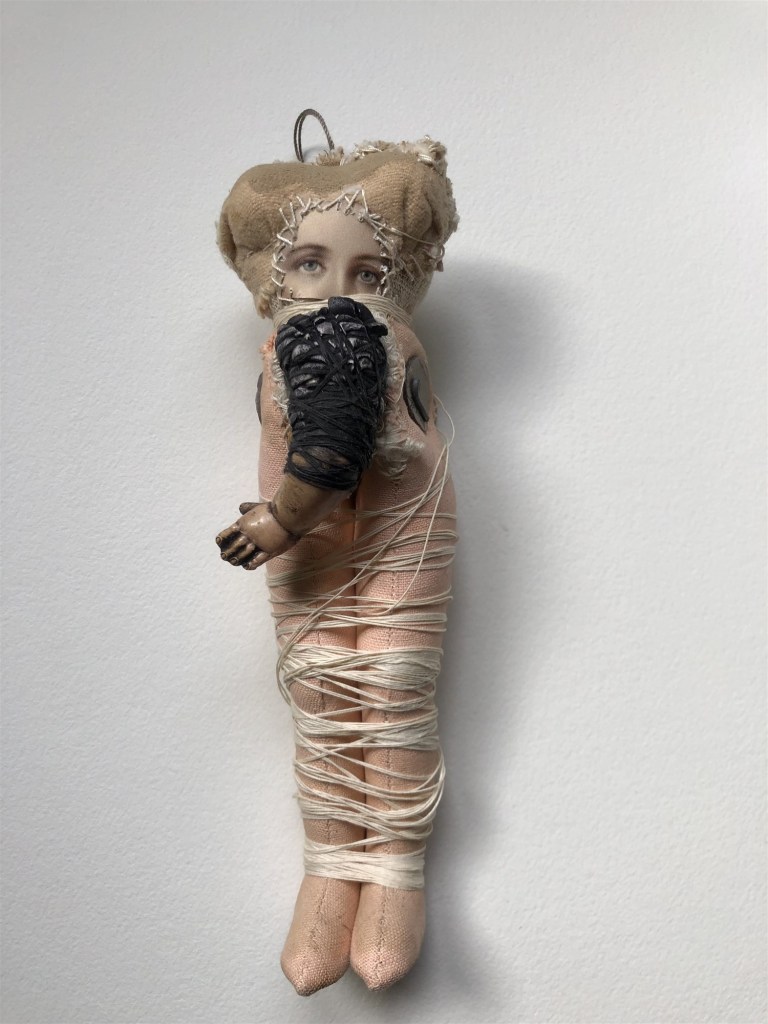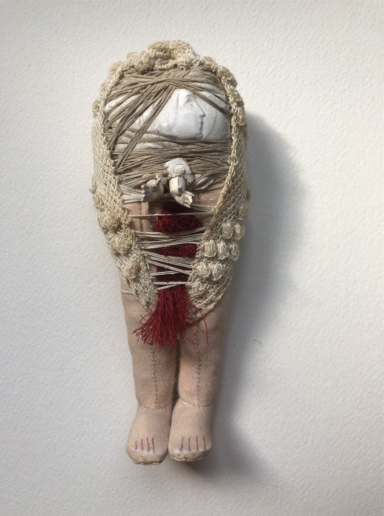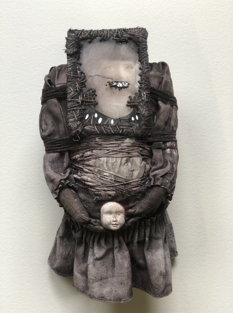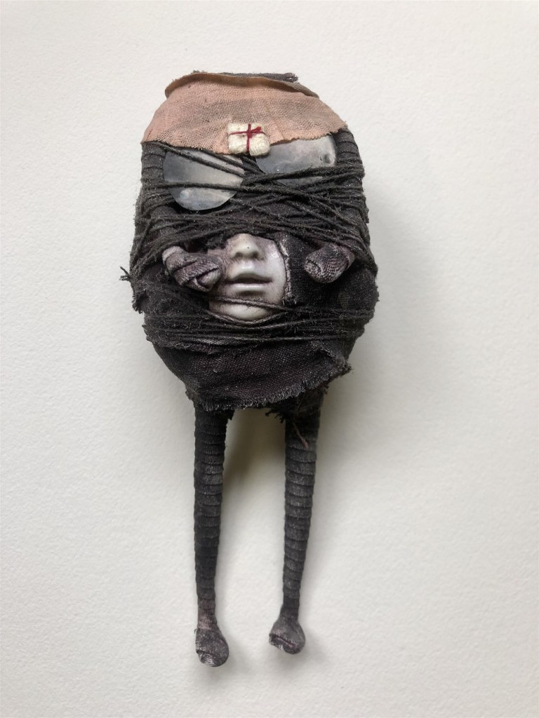 POUPÉE N°371 – Tissus – Broderie – Céramique – Respirateur. 22 cm X 7 cm.