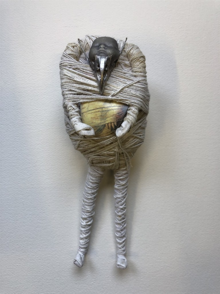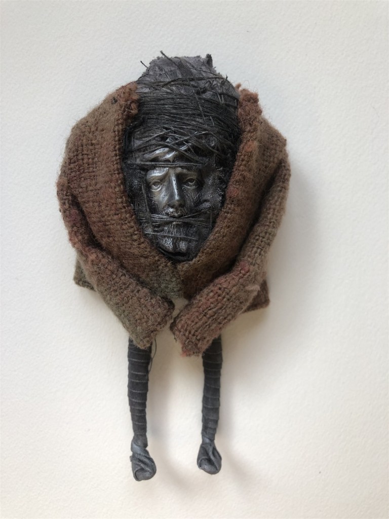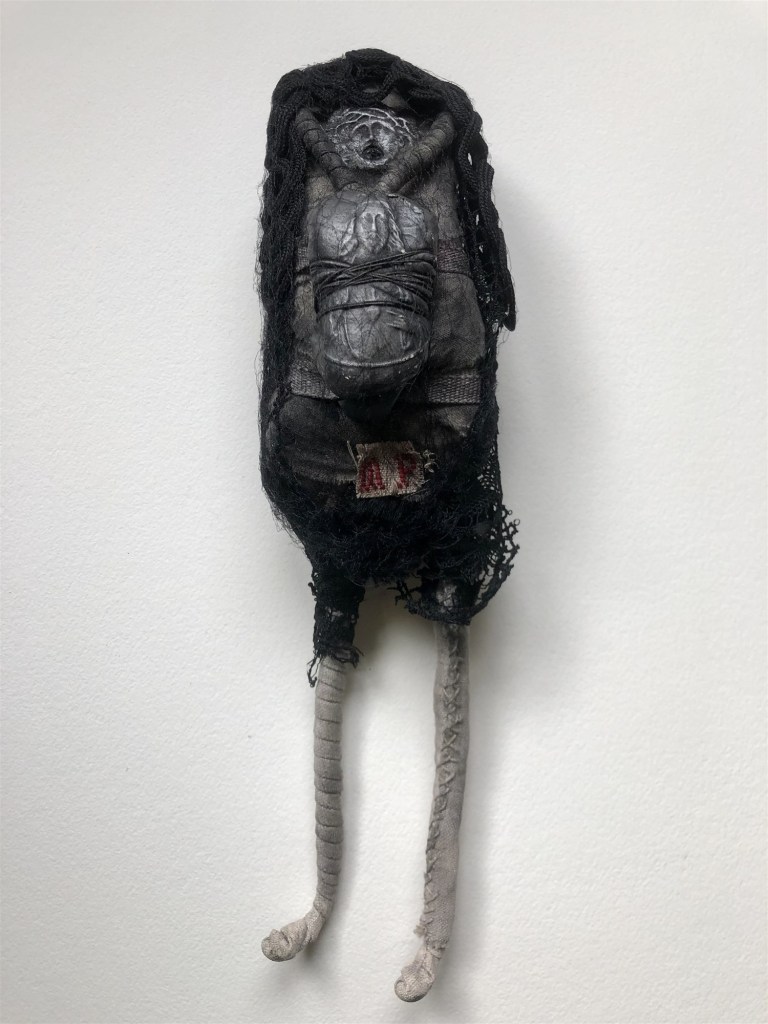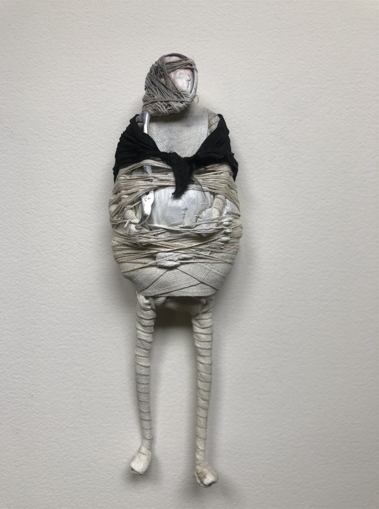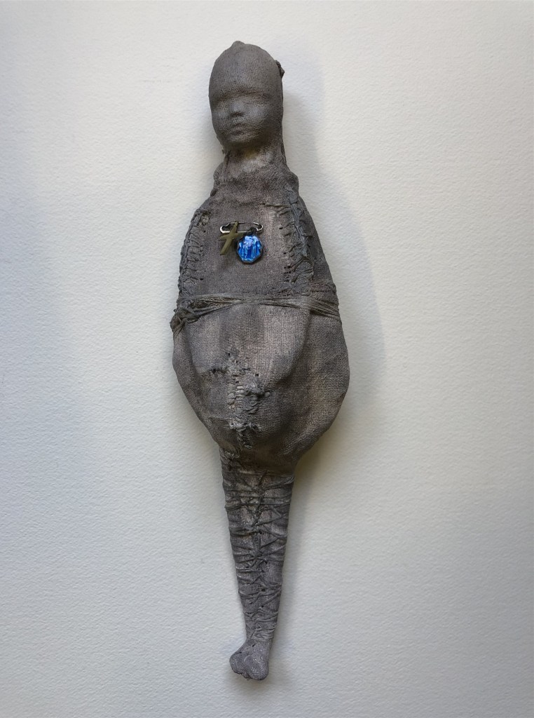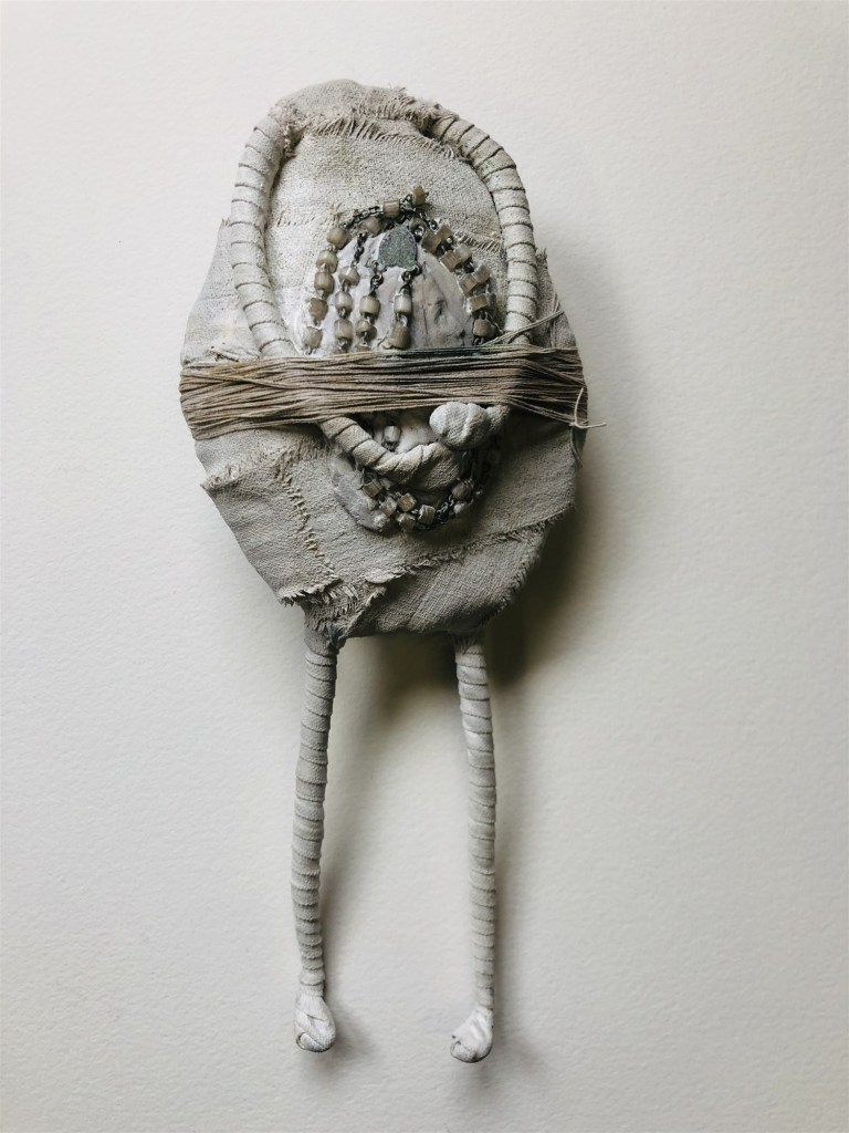 POUPÉE N°371 – Tissus – Broderie – Céramique – Respirateur. 22 cm X 7 cm.
