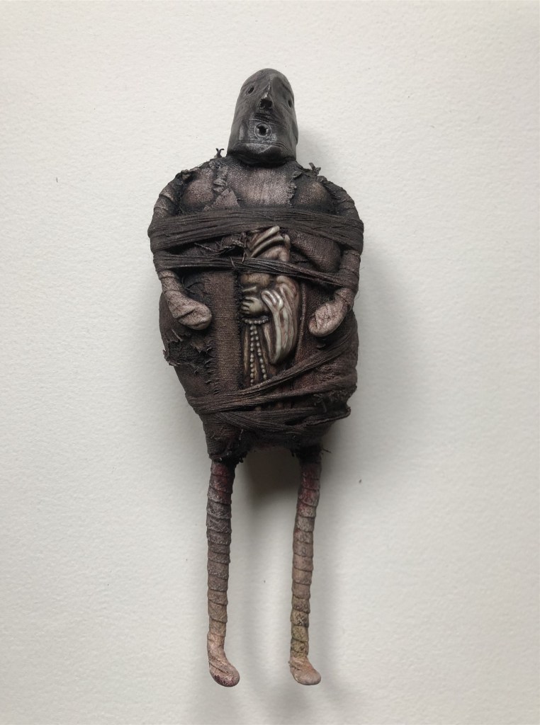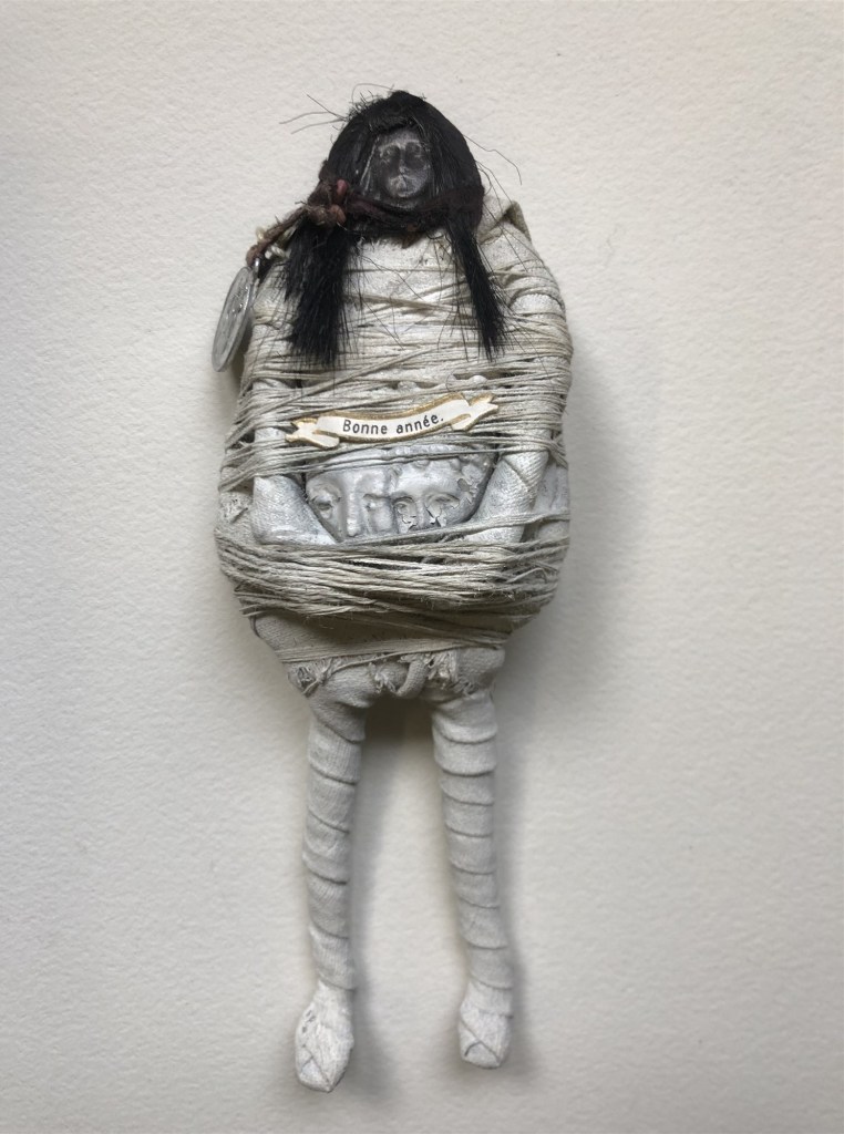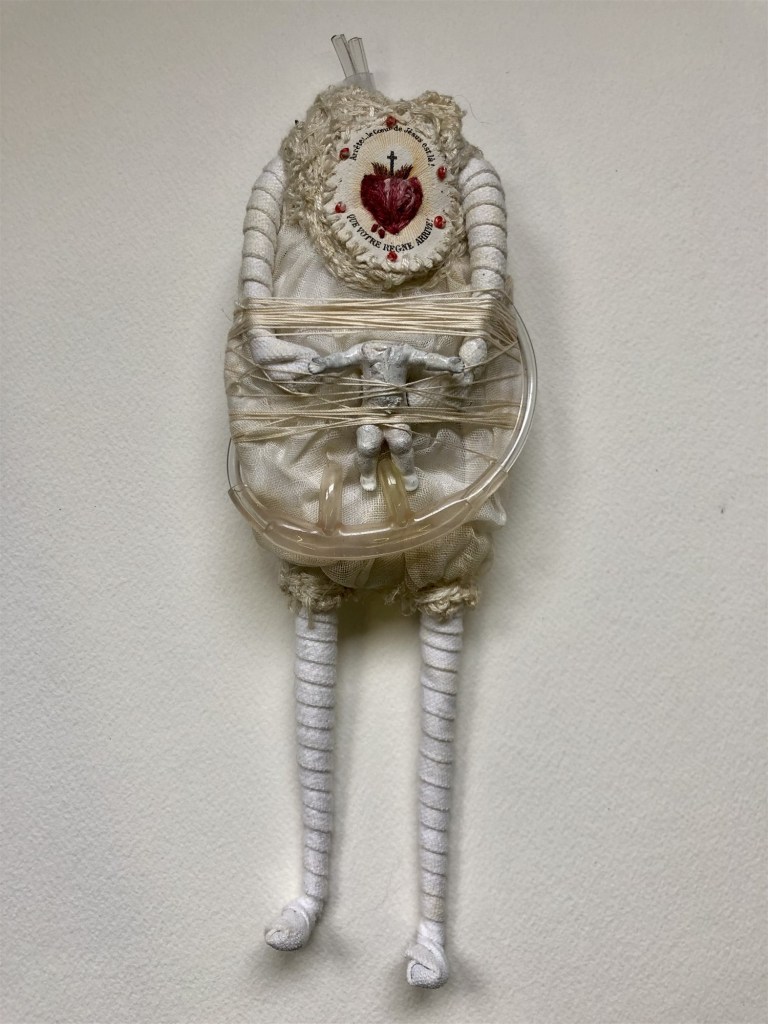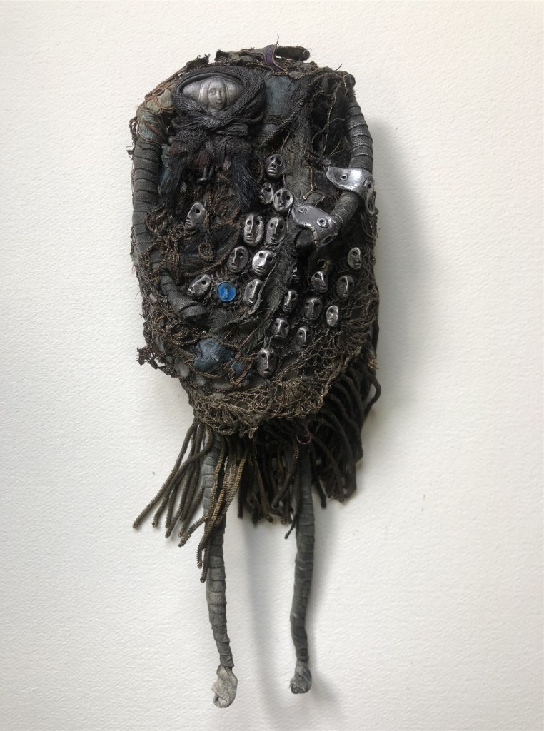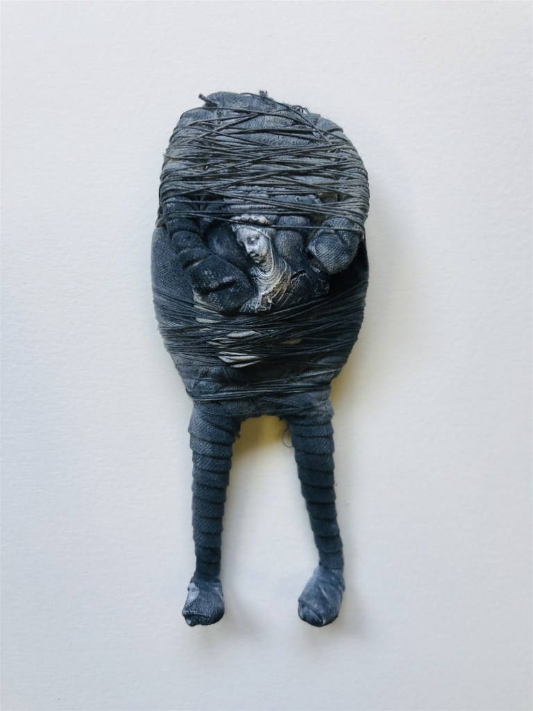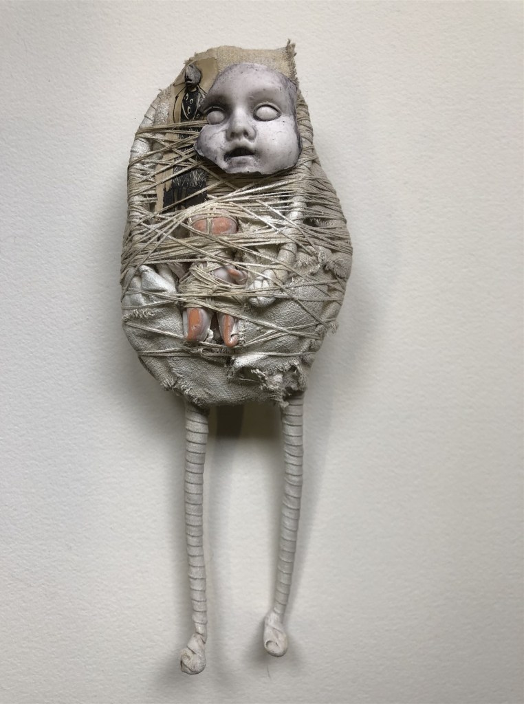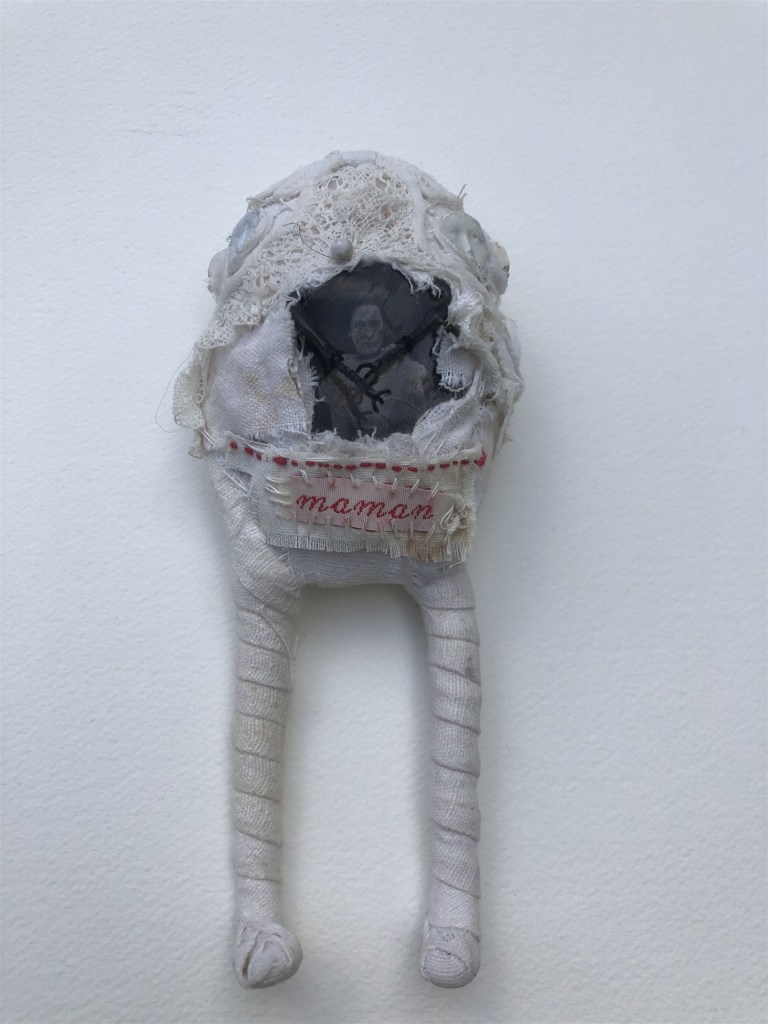 POUPÉE N°371 – Tissus – Broderie – Céramique – Respirateur. 22 cm X 7 cm.