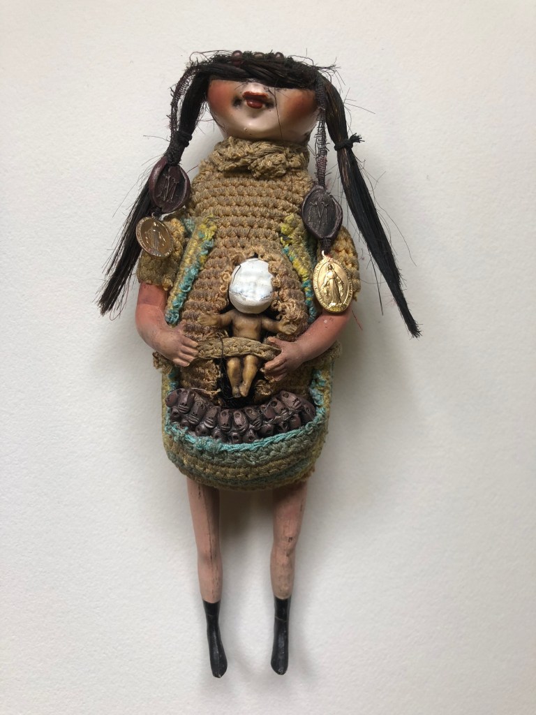POUPÉE N°390 – Tissus – Céramique – Cheveux – Médaille – Tricot – Perles. 25 cm X 7 cm.