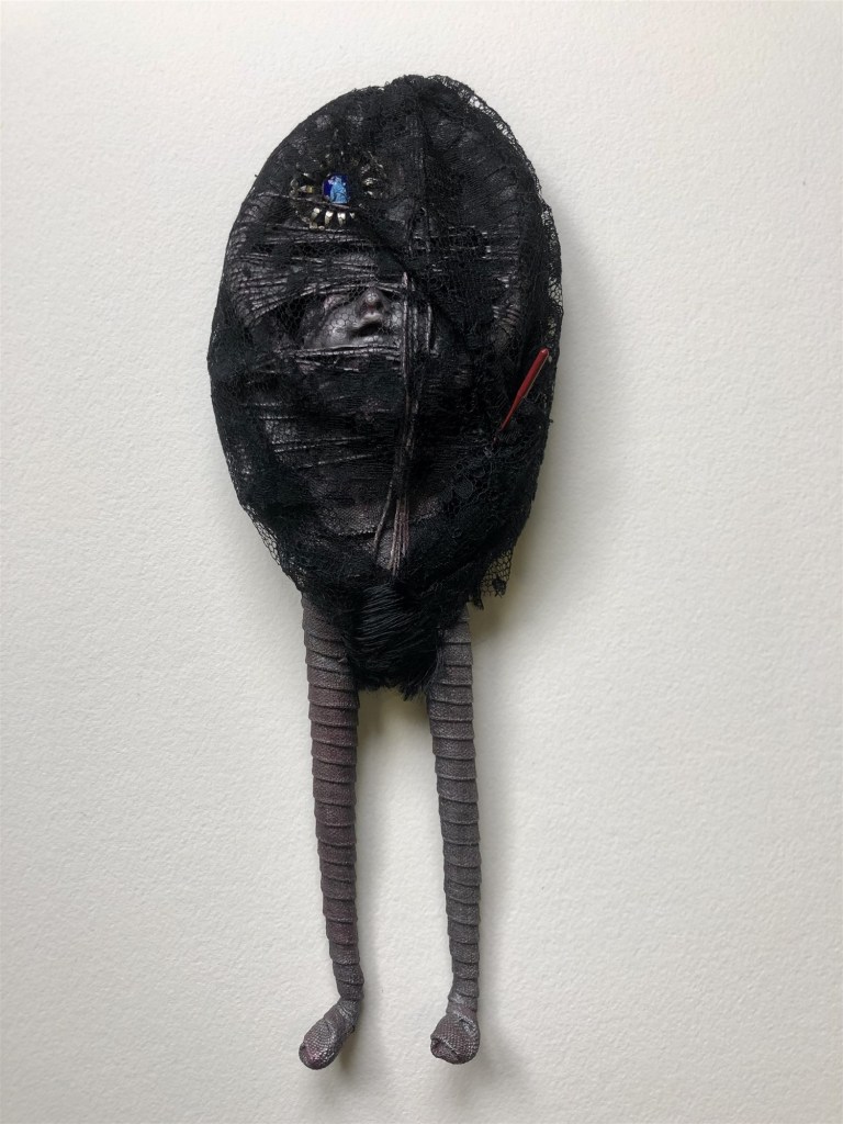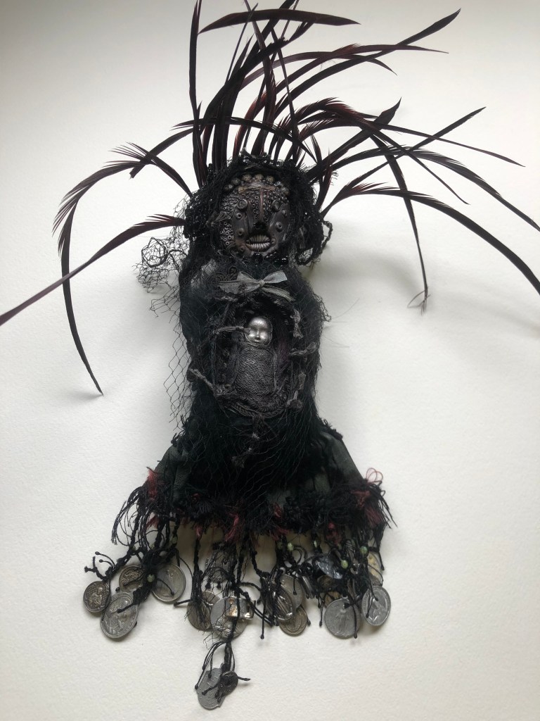 POUPÉE N°394 – Tissus – Céramique – Broderie – MP – Voile noir. 28 cm X 8 cm.