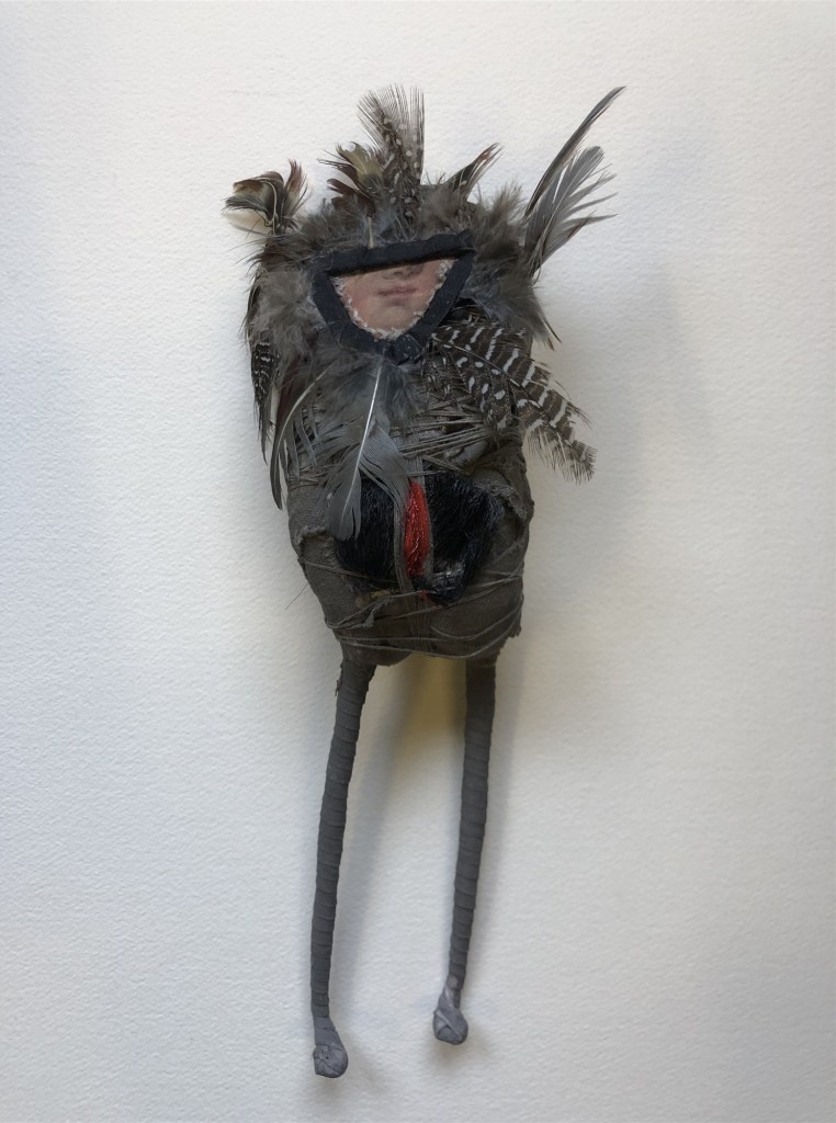 POUPÉE N°367 – Tissus – Plumes – Céramique. 22 cm X 7 cm.