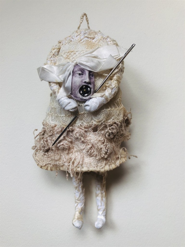 POUPÉE N°353 – Tissus – Broderie – Céramique – Aiguille. 19 cm X 11 cm.