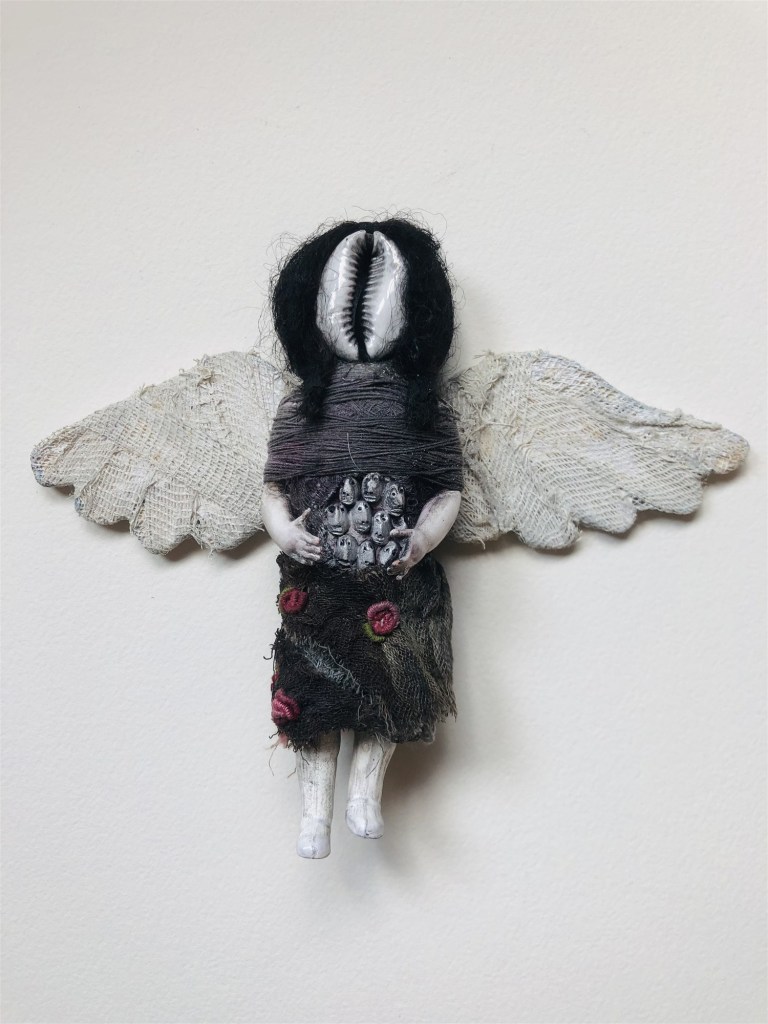 POUPÉE N°343 – Tissus – Ailes d’anges – Céramique – Coquillage. 15 cm X 8 cm.
