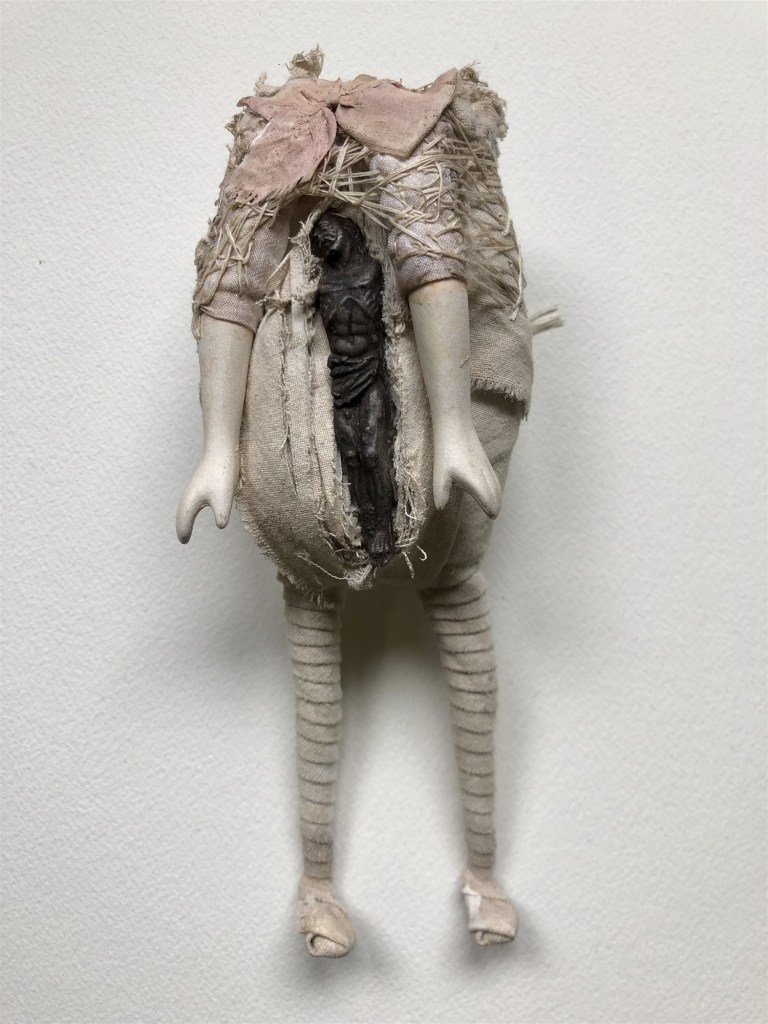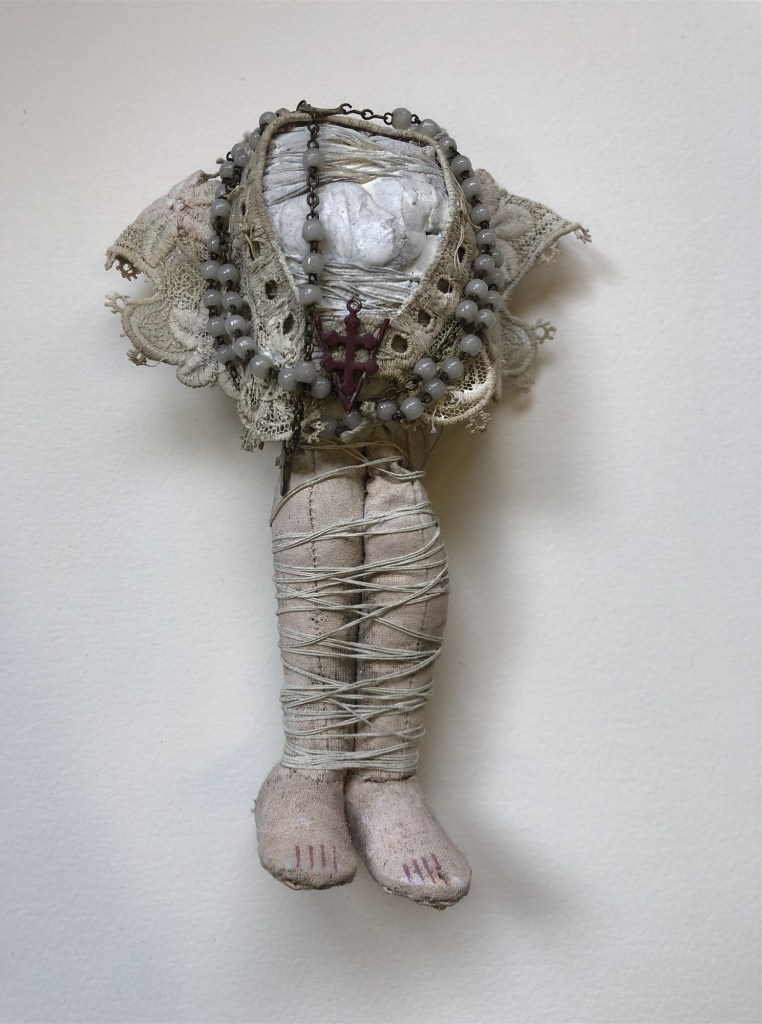 POUPÉE N°373 – Tissus – Céramique – Broderie – Jambes Christ. 24 cm X 8 cm.