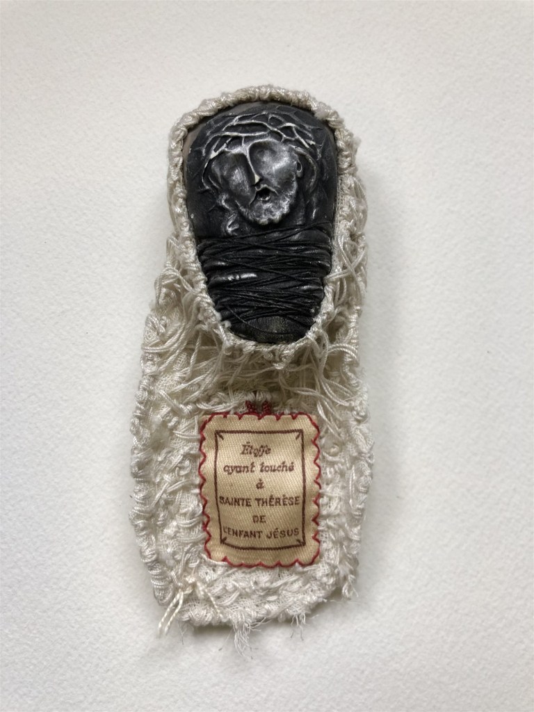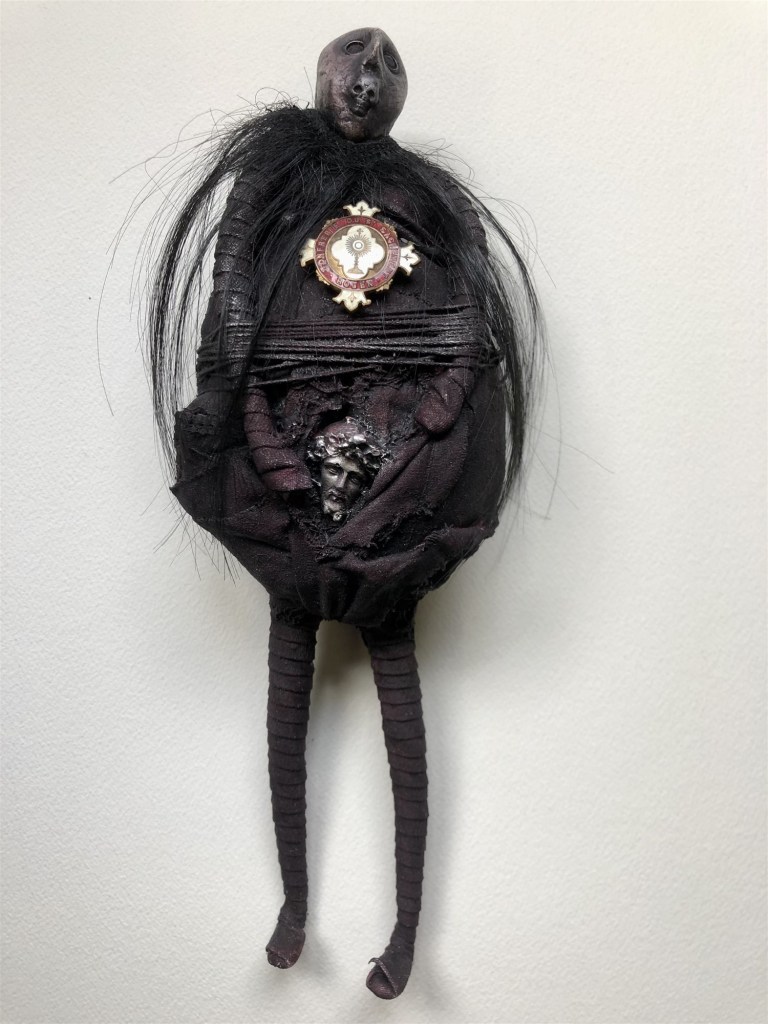POUPÉE N°311 – Tissus – Céramique – Christ – Médaille. 15 cm X 5 cm.
