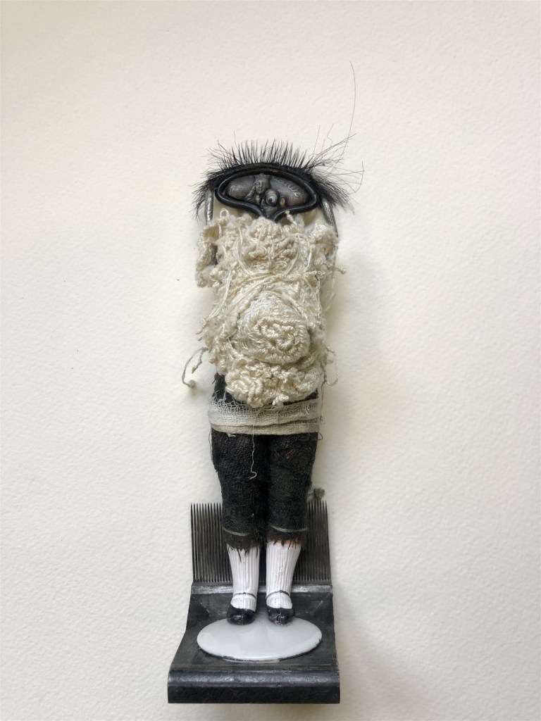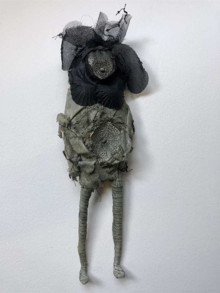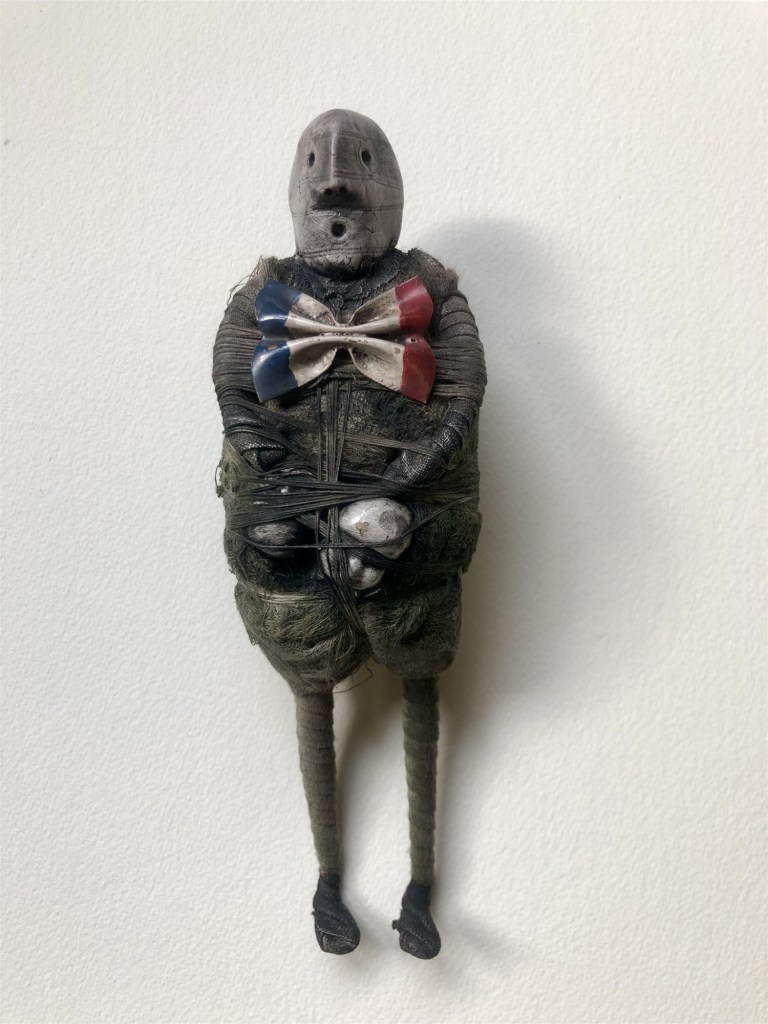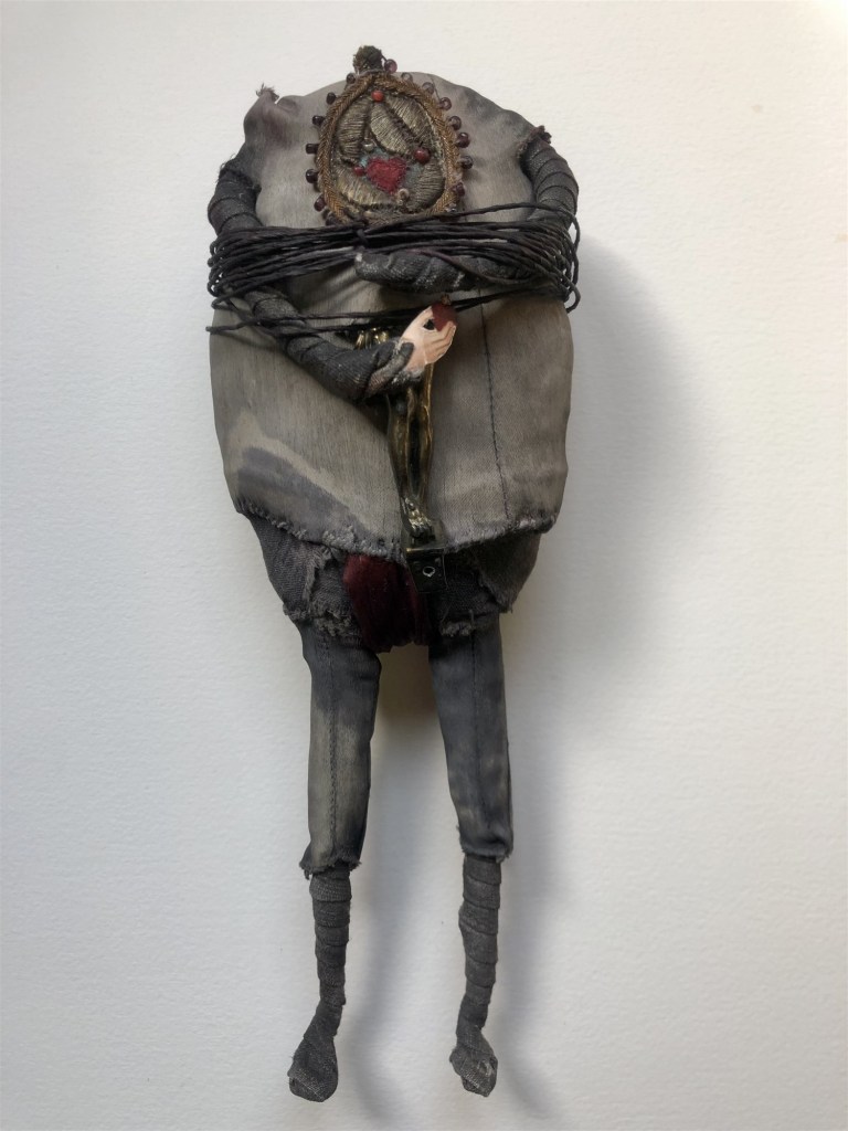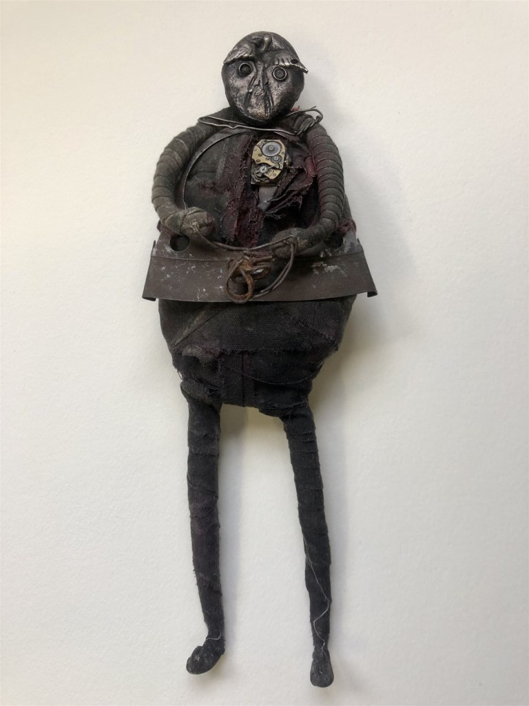 POUPÉE N°480 – Tissus – Céramique – Rouage de montre -Fer. 27 cm X 9 cm.