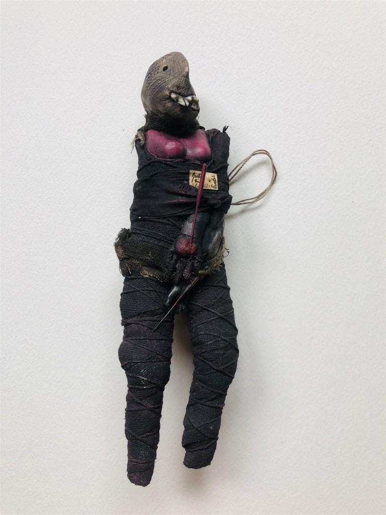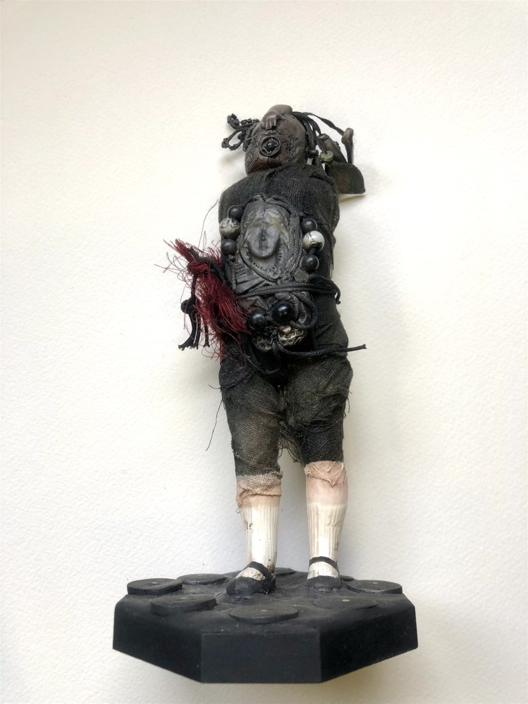 POUPÉE N°490 – Tissus – Céramique – Cuir – Fils de soie rouge -Perles. 24 cm X 7 cm.