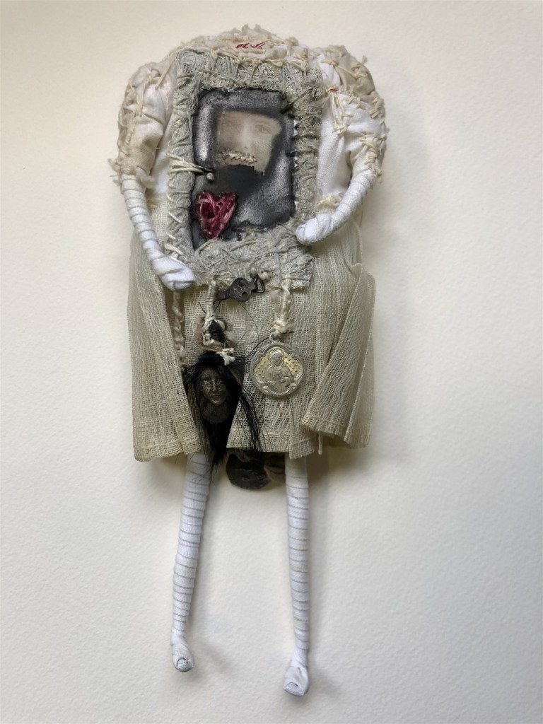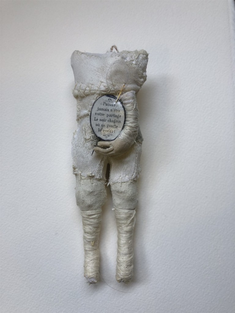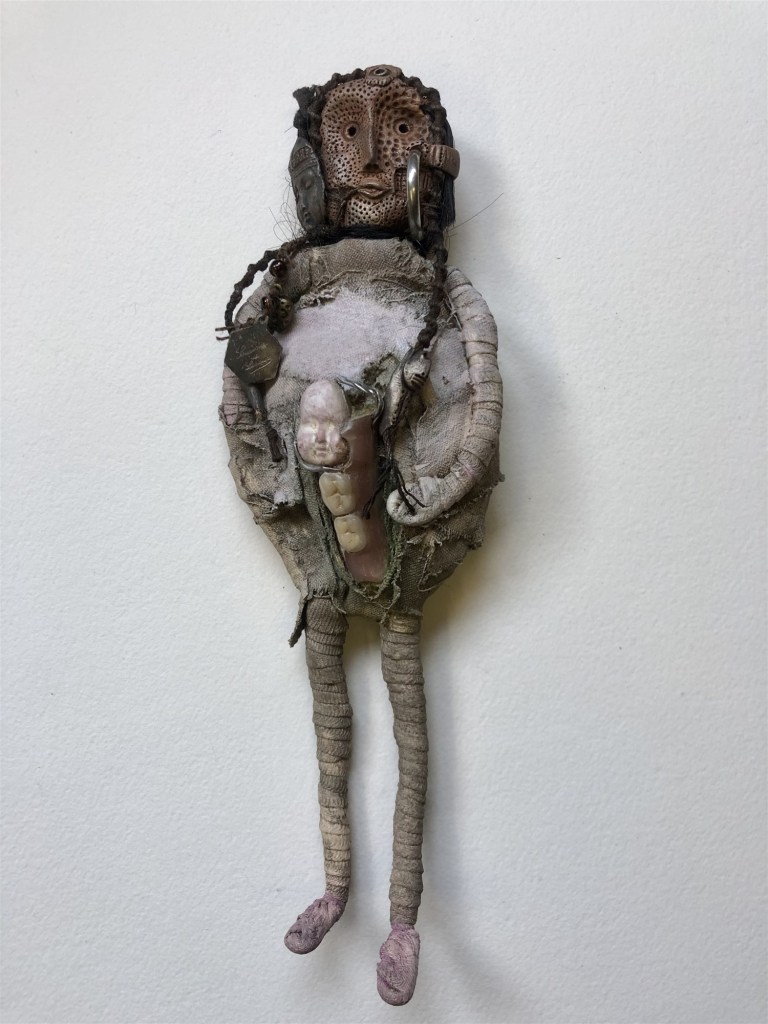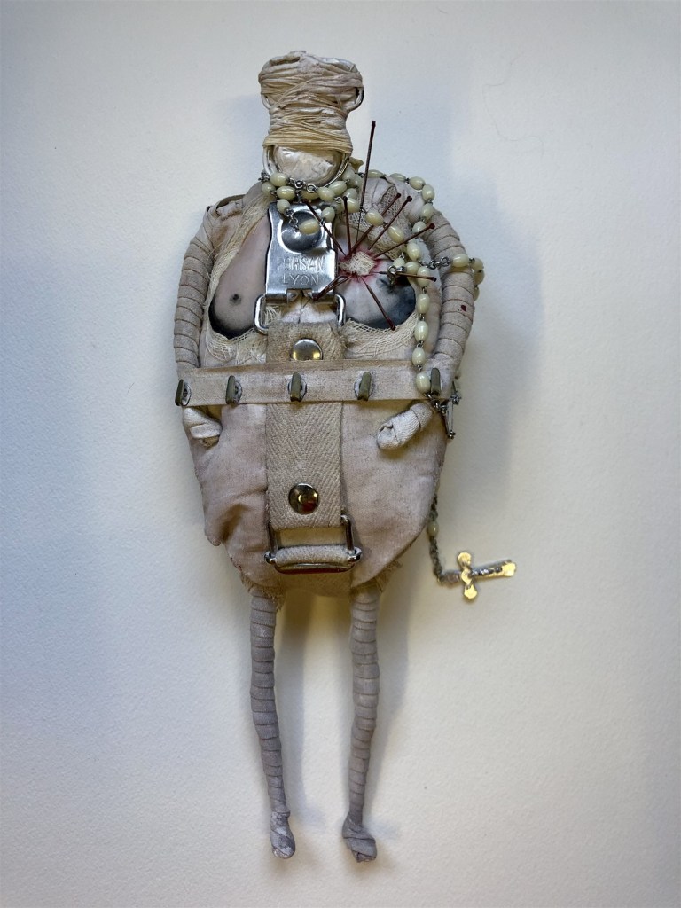 POUPÉE N°456 – Tissus – Céramique – Aiguille acupuncture – Seins maman – Médaille – Fer. 20 cm X 8 cm.