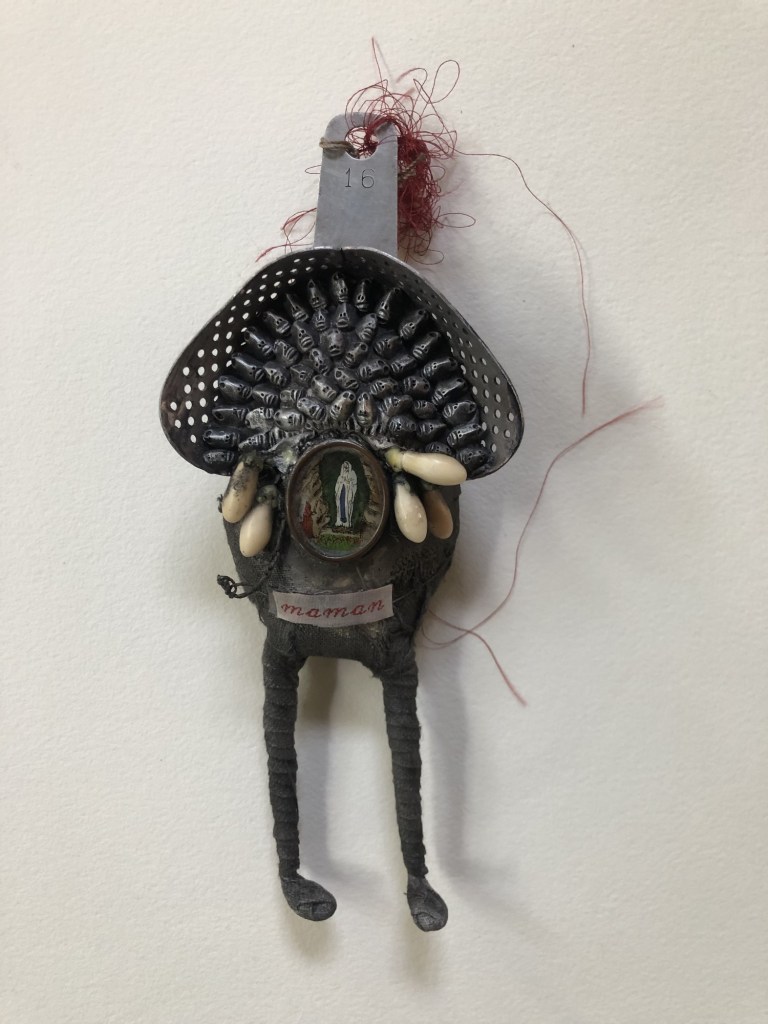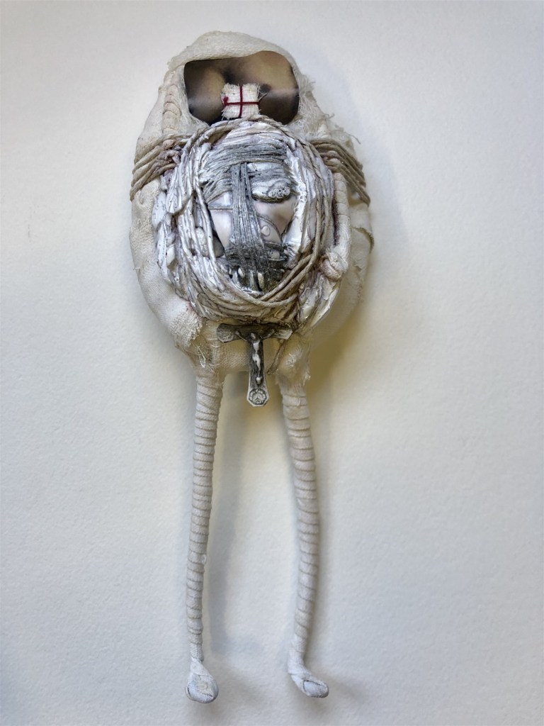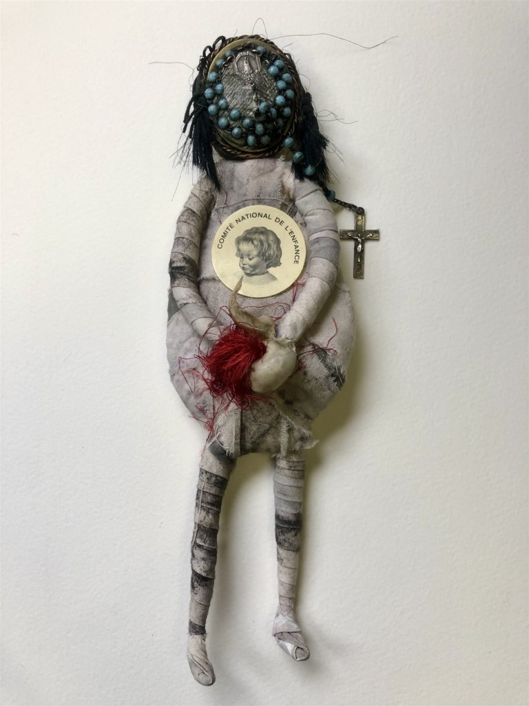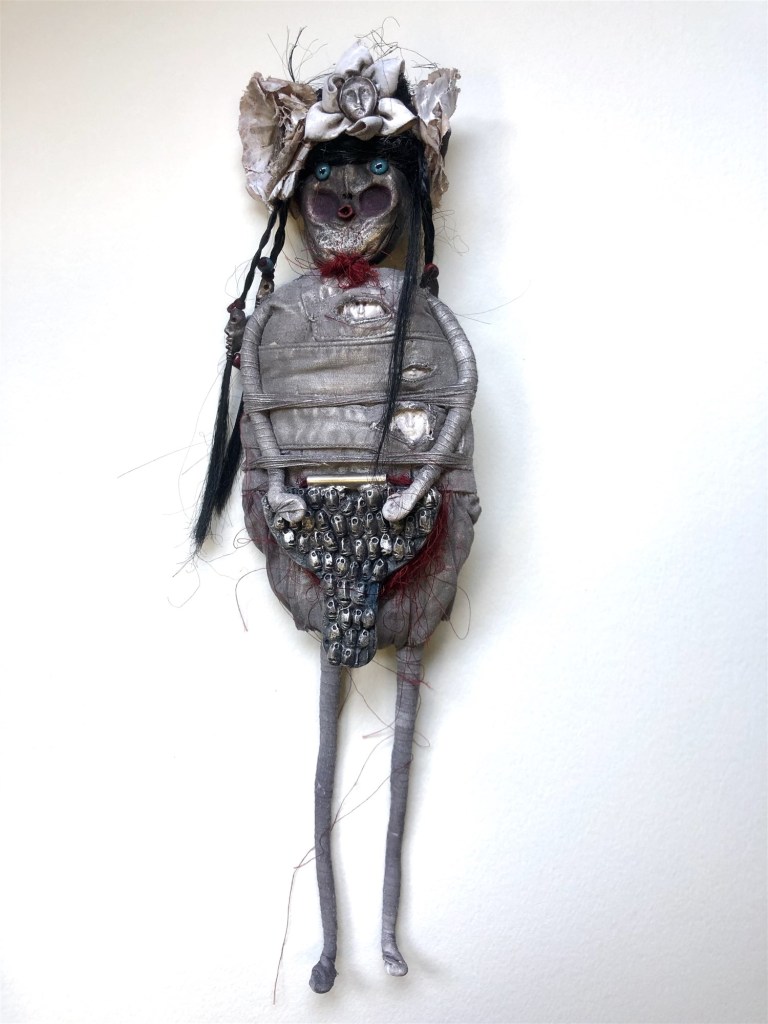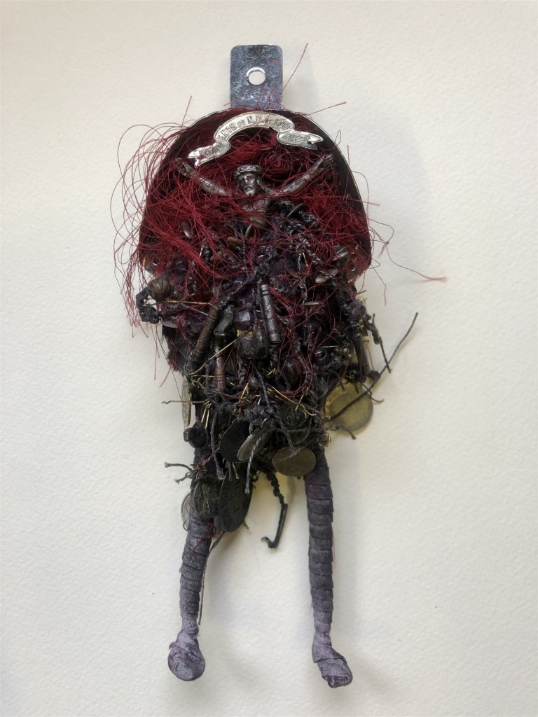 POUPÉE N°456 – Tissus – Céramique – Aiguille acupuncture – Seins maman – Médaille – Fer. 20 cm X 8 cm.