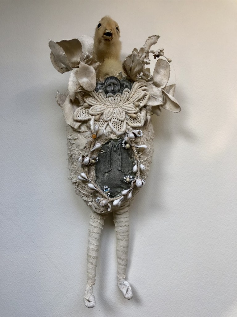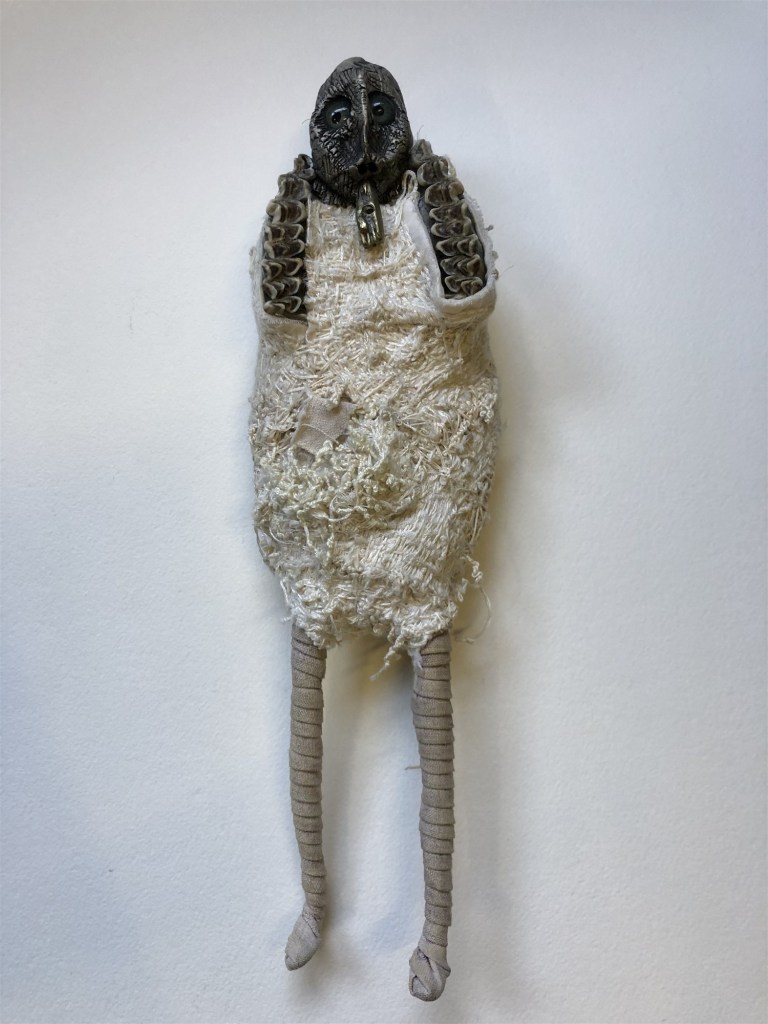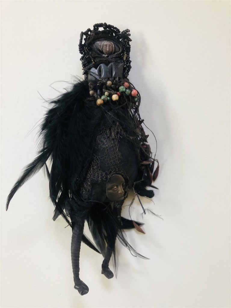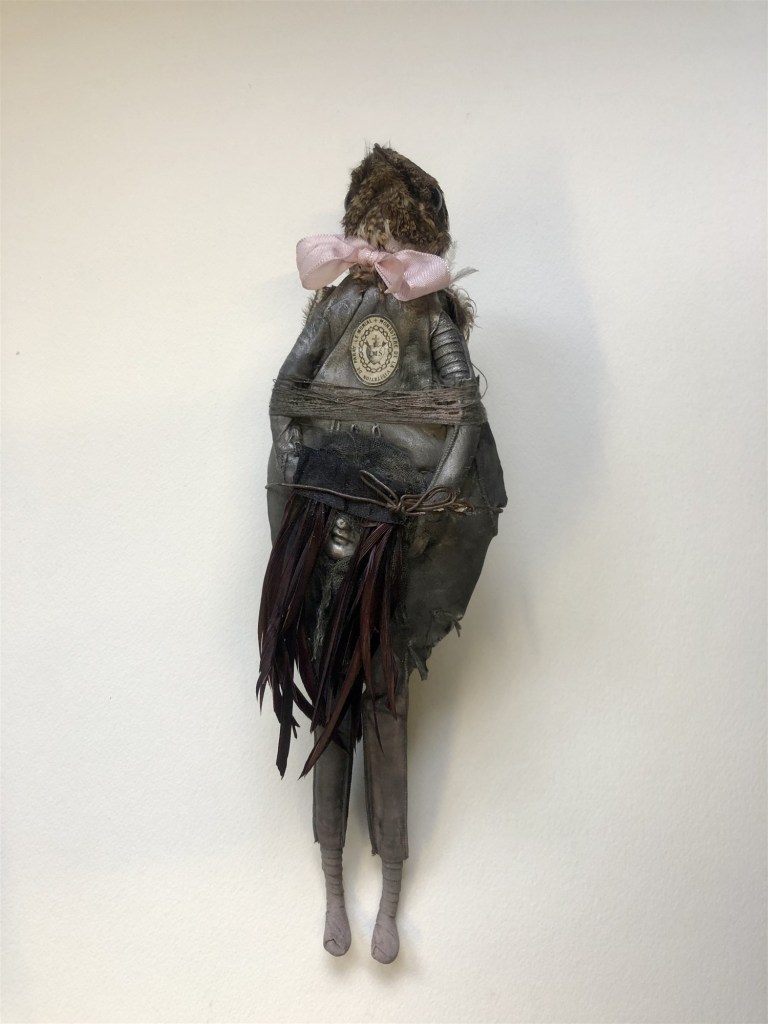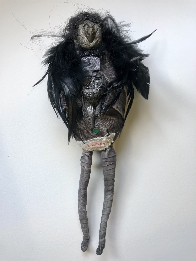 POUPÉE N°494 – Tissus – Céramique – Tête d’oiseau – Plumes – Fer. 28 cm X 8 cm.