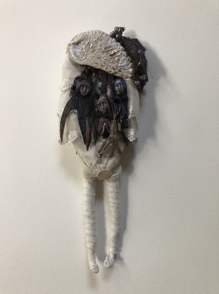 POUPÉE N°459 – Tissus – Céramique – Plumes – Coquillage. 18 cm X 8 cm.