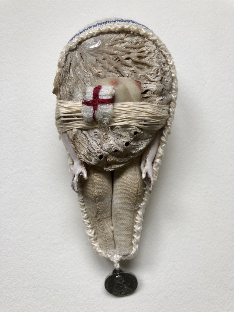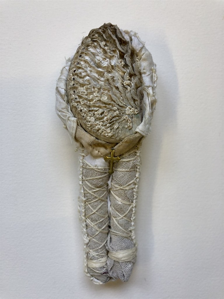 POUPÉE N°454 bis – Tissus – Coquillage – Croix. 16 cm X 6 cm.