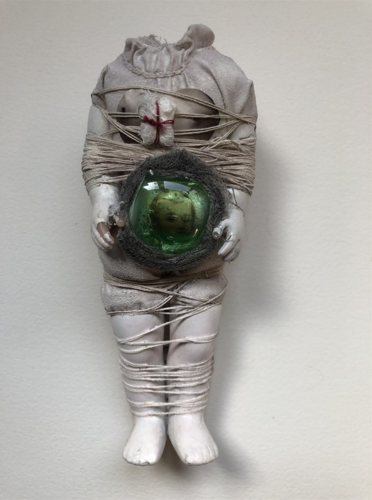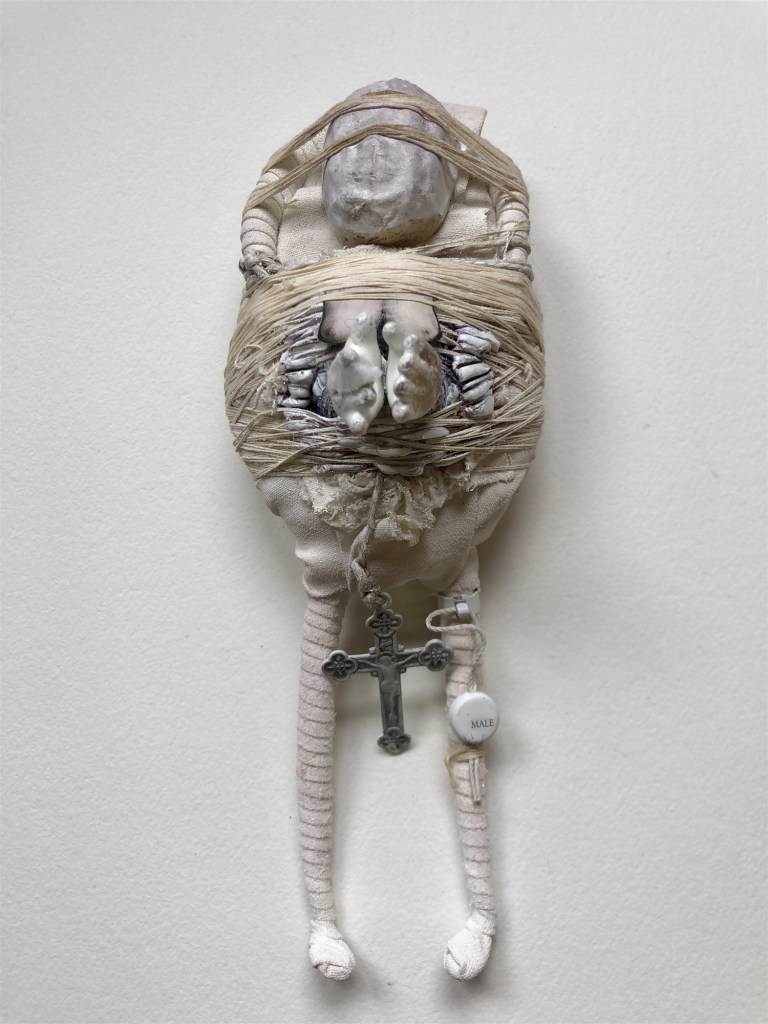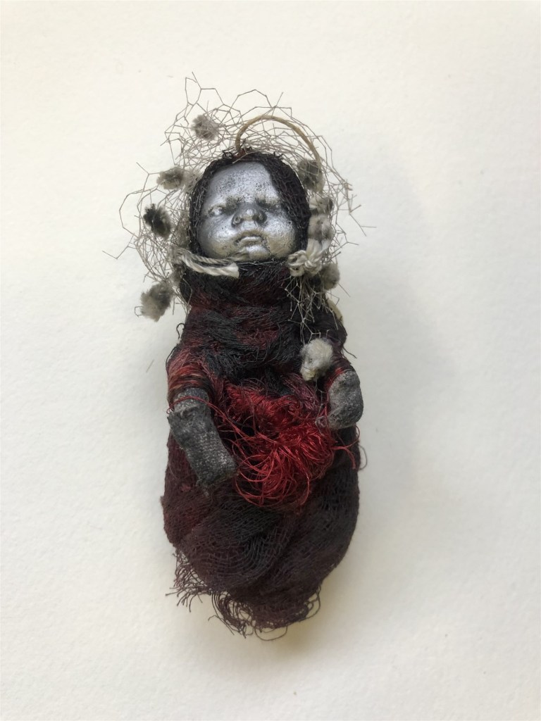 POUPÉE N°423 – Tissus – Bébé en cire – Fer – Ficelle. 29 cm X 9 cm.