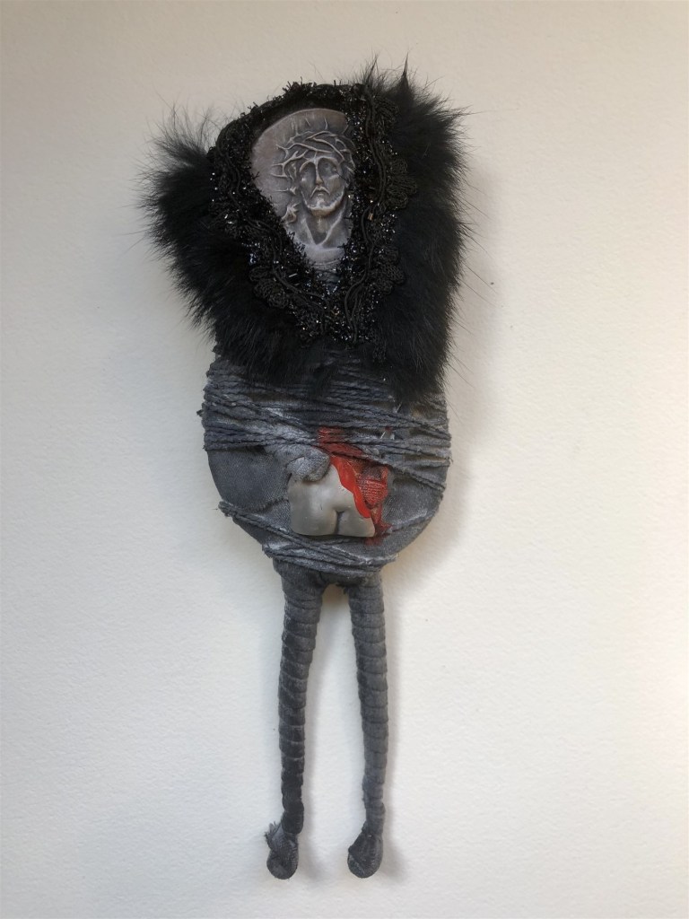 POUPÉE N°463 – Tissus – Céramique – Christ – Ficelle. 25 cm X 8 cm.