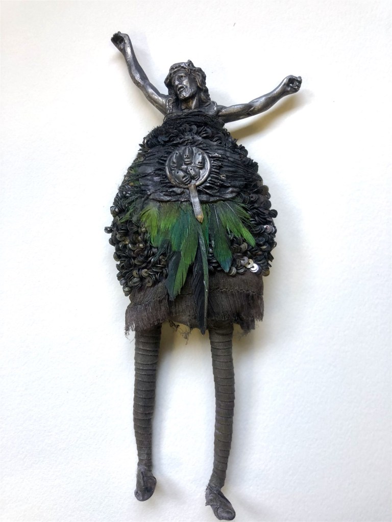 POUPÉE N°476 – Tissus – Céramique – Plumes – Christ. 23 cm X 10 cm.
