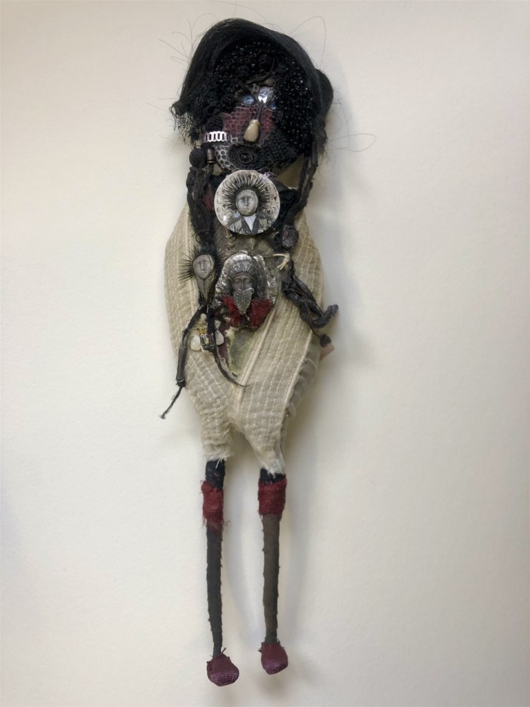 POUPÉE N°444 – Tissus – Céramique – Médailles – Os – Plumes. 36 cm X 10 cm.