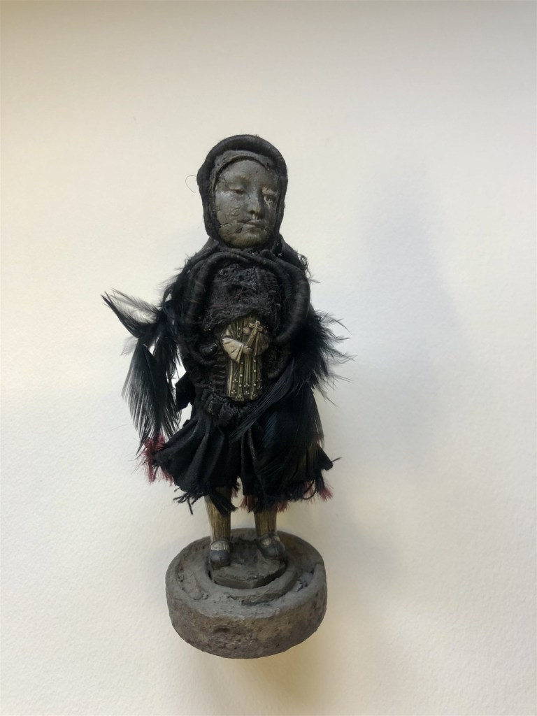 POUPÉE N°401 – Tissus – Broderie – Aiguille – Pieds en cire. 18 cm X 6 cm.