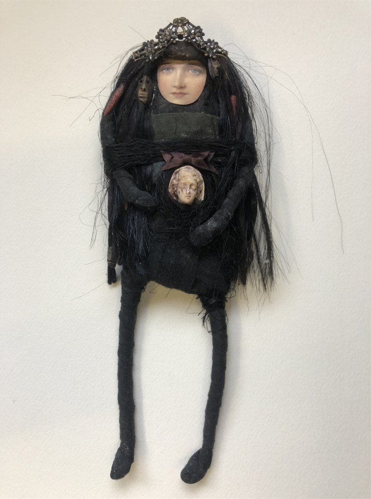 POUPÉE N°500 – Tissus – Céramique – Broderie – Cheveux – Vrillette. 23 cm X 8 cm