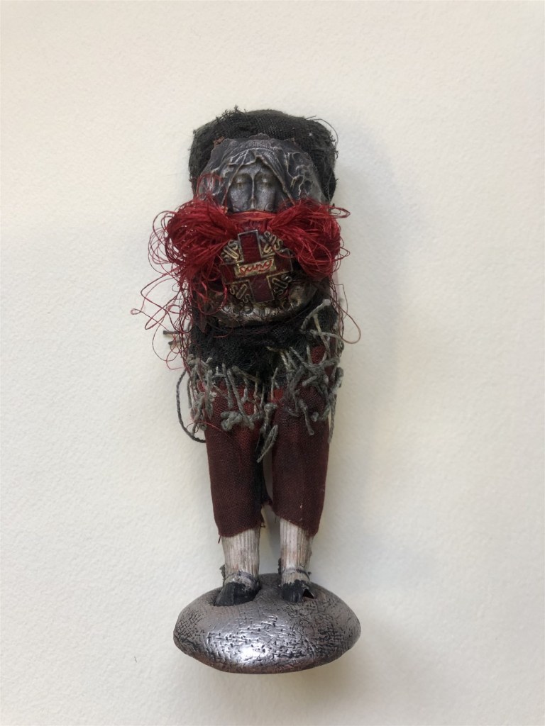 POUPÉE N°498 – Tissus – Céramique – Fils de soie rouge – Broche SANG – Socle. 14 cm X 4 cm.