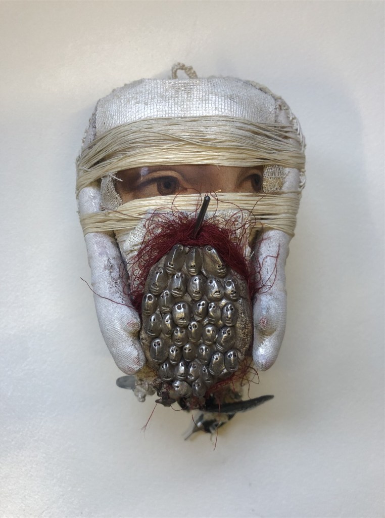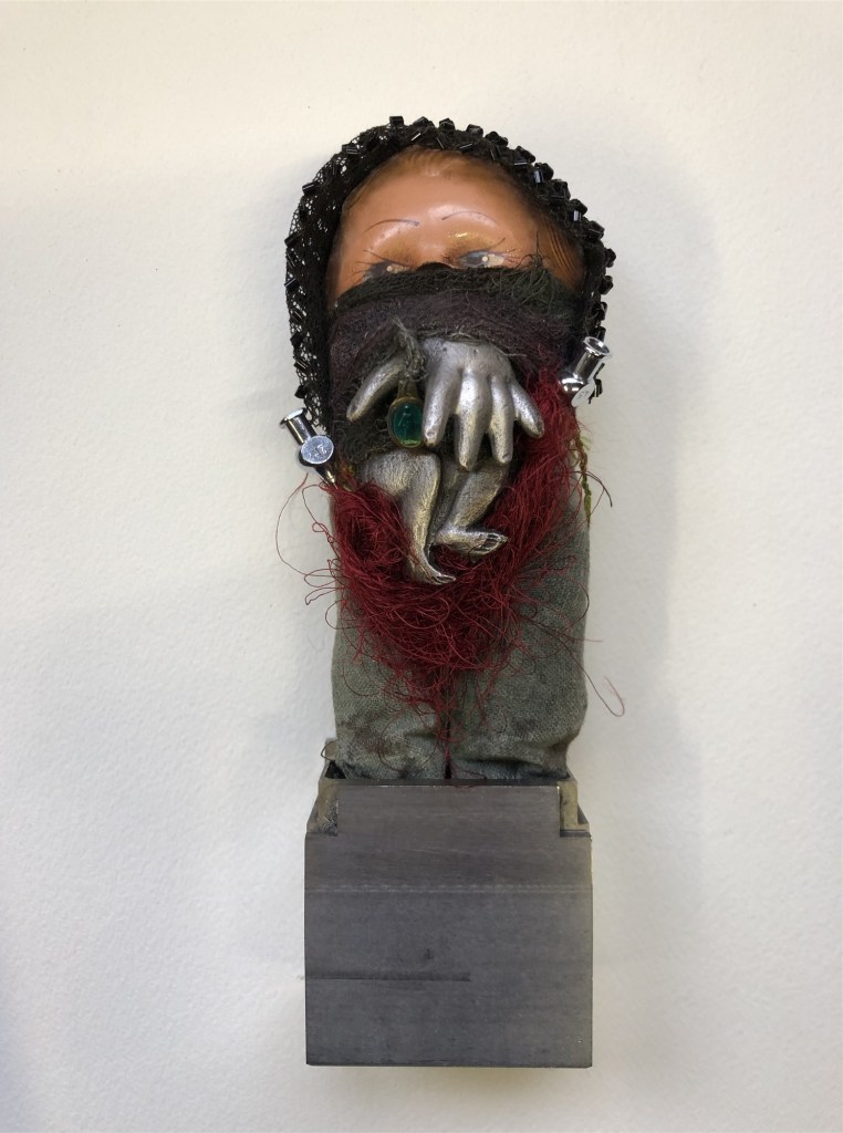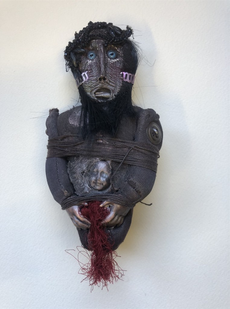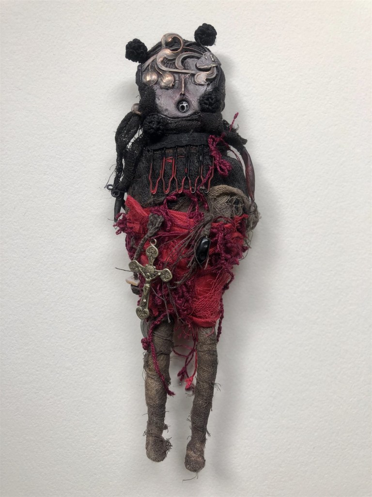 POUPÉE N°566 – Tissus – Céramique – Perles – Fils de soie rouge – Fer. 15 cm x 9 cm.