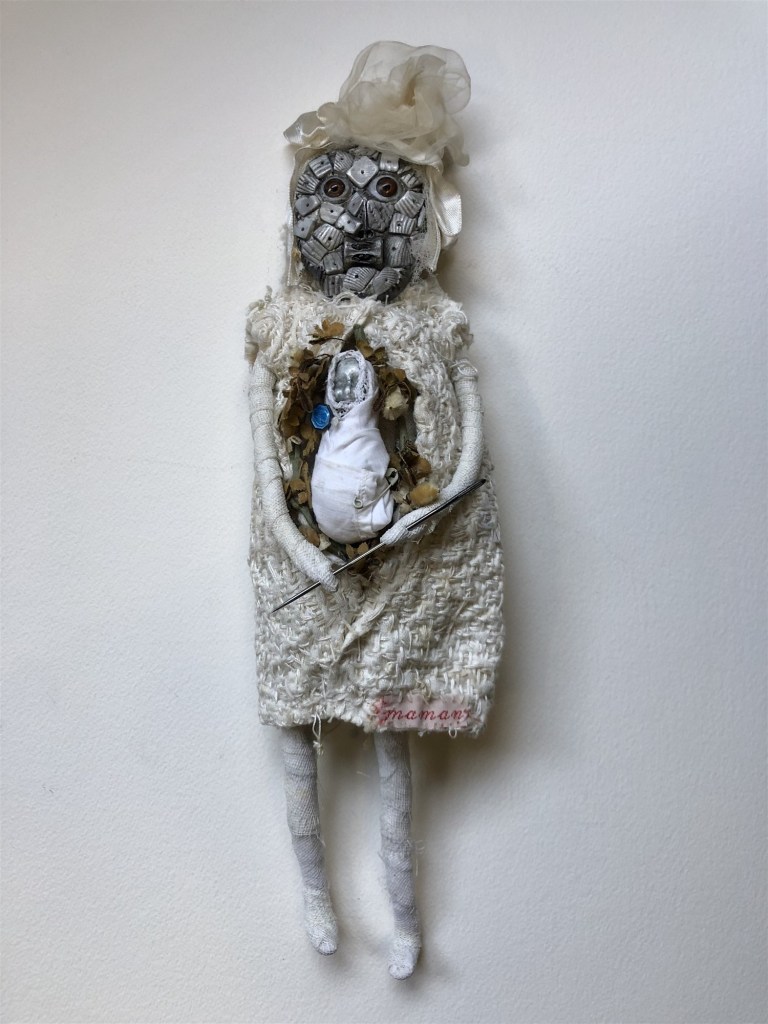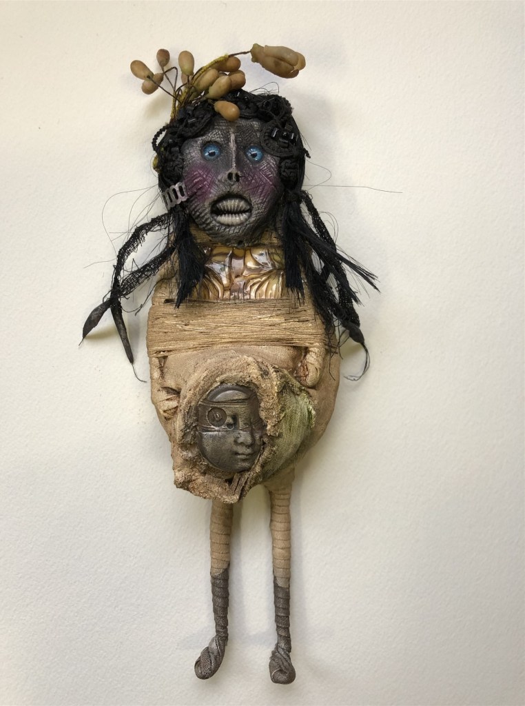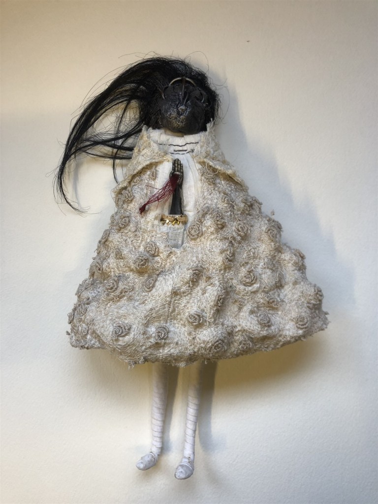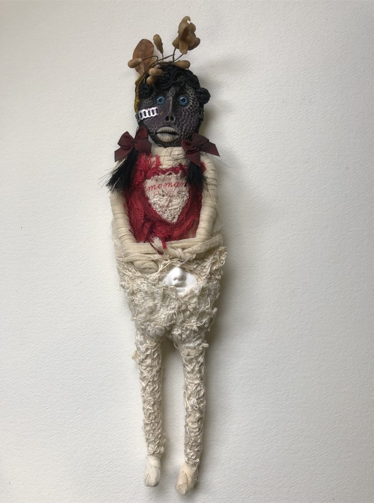 POUPÉE N°506 – Tissus – Broderie – Pince de lucarne – Céramique. 15 cm X 8 cm.