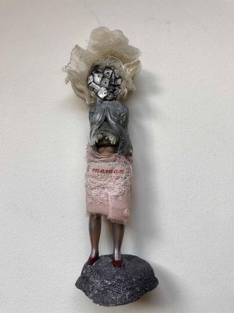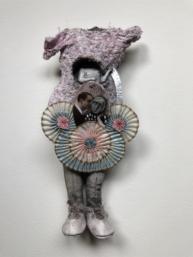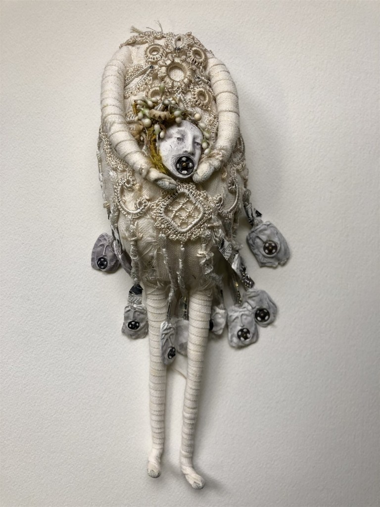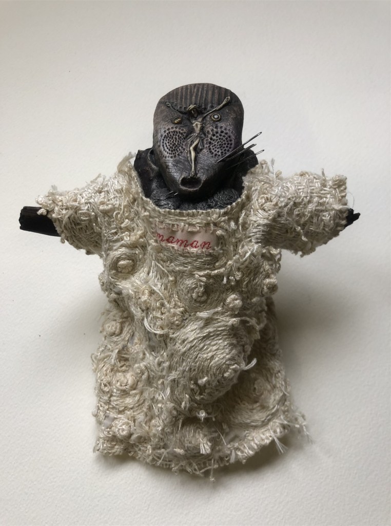 POUPÉE N°506 – Tissus – Broderie – Pince de lucarne – Céramique. 15 cm X 8 cm.