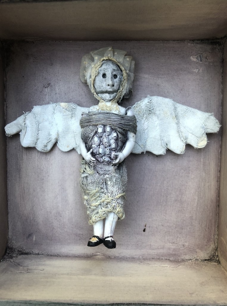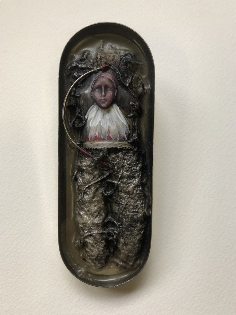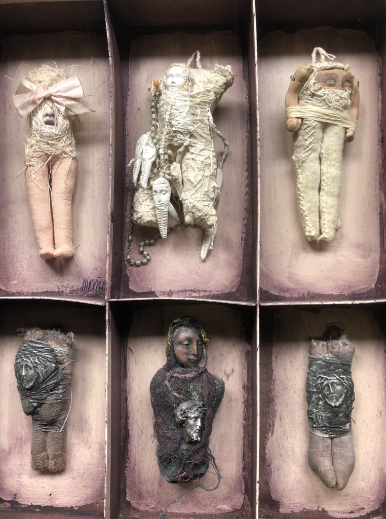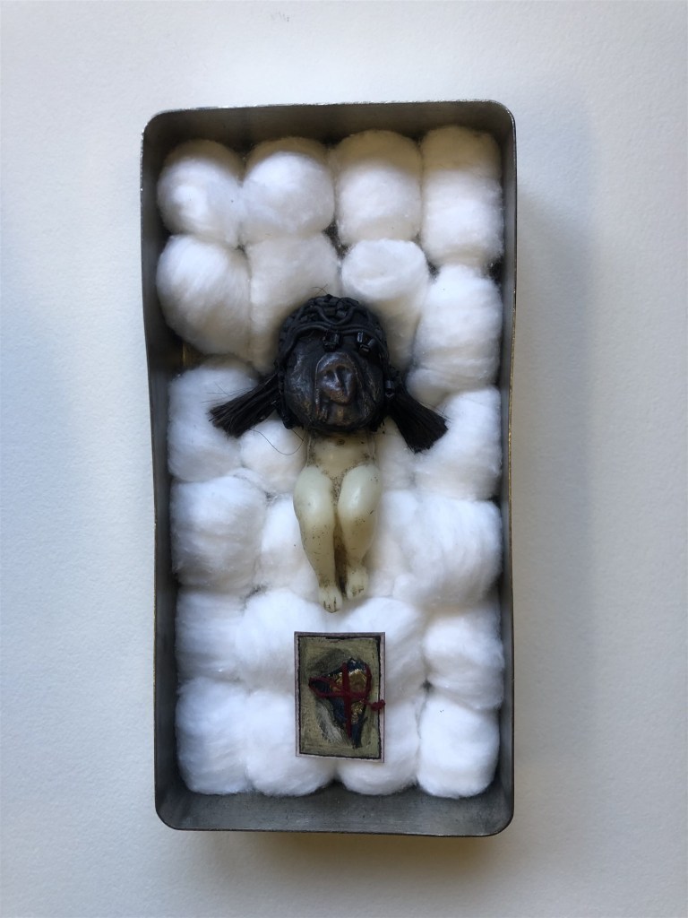 POUPÉE N°563 – Boîte médicale – Corps ancien en cire – Céramique – Perles – Cheveux – Cœur cousu – Etoffe ayant touché le dernier des rois Pessinois. 20 cm x 10 cm.