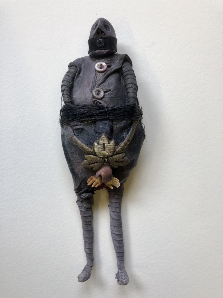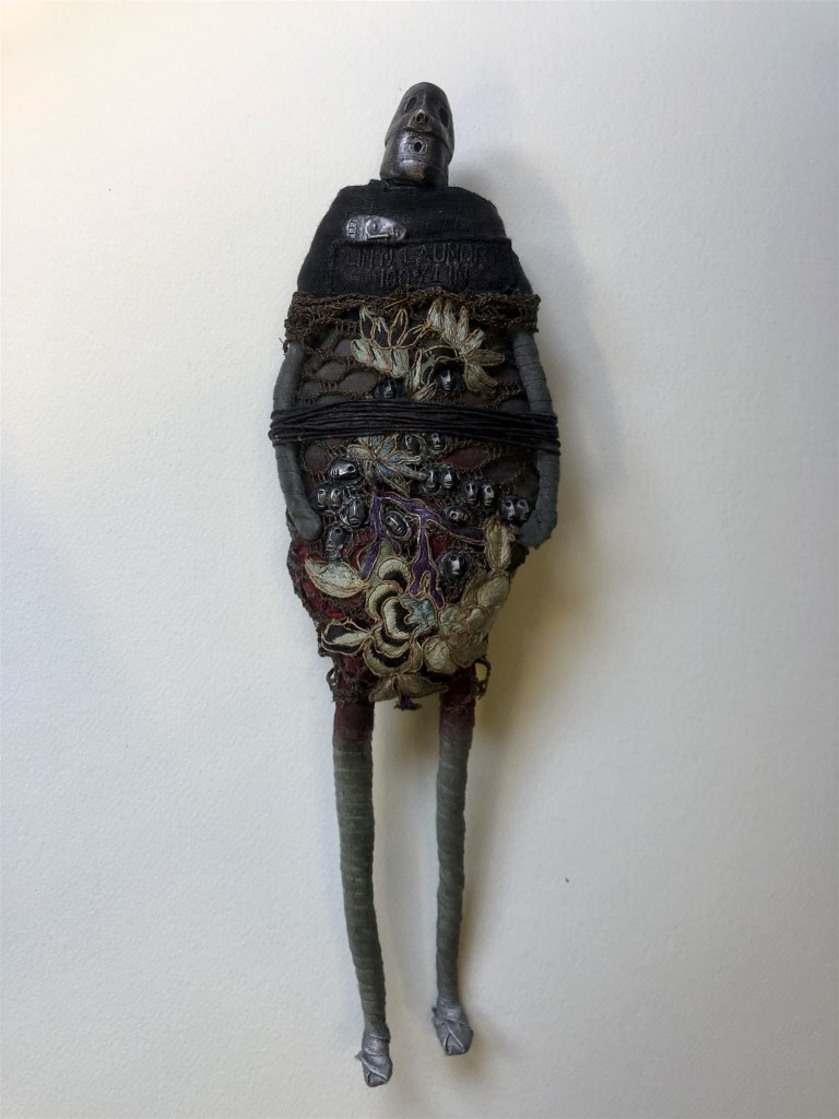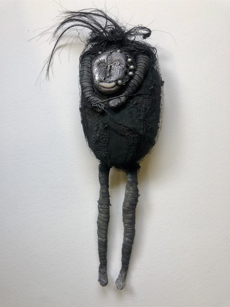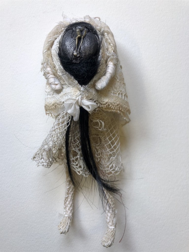 POUPÉE N°538 – Tissus – Broderie – Larve d’insecte. 18 cm x 7 cm.
