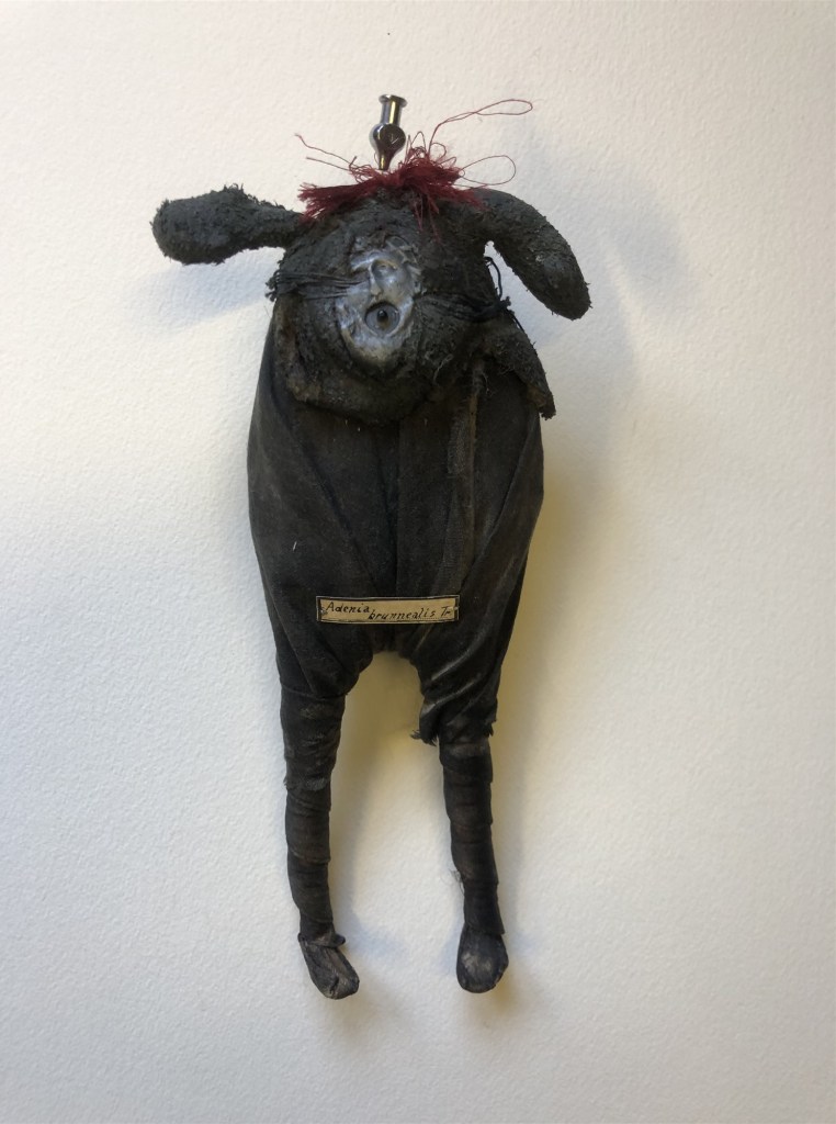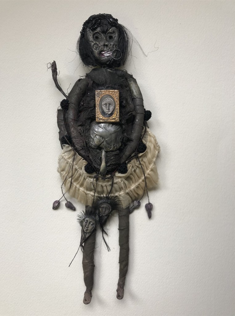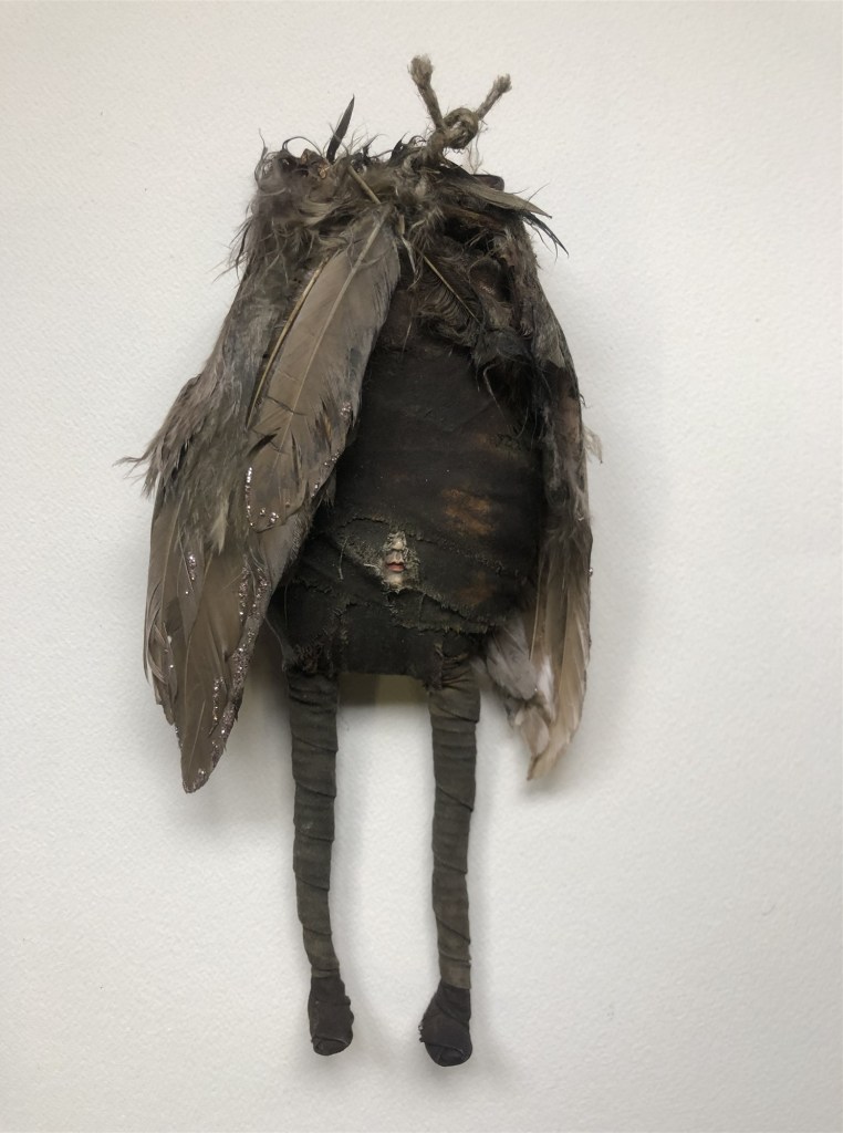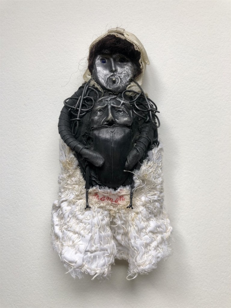 POUPÉE N°538 – Tissus – Broderie – Larve d’insecte. 18 cm x 7 cm.