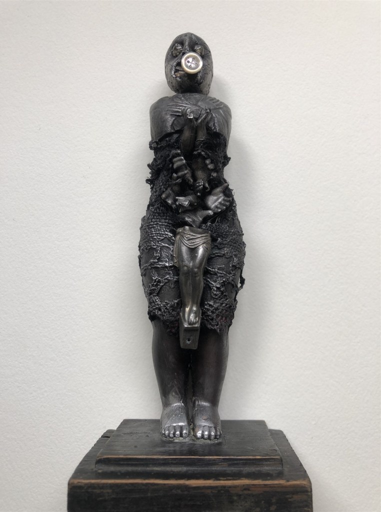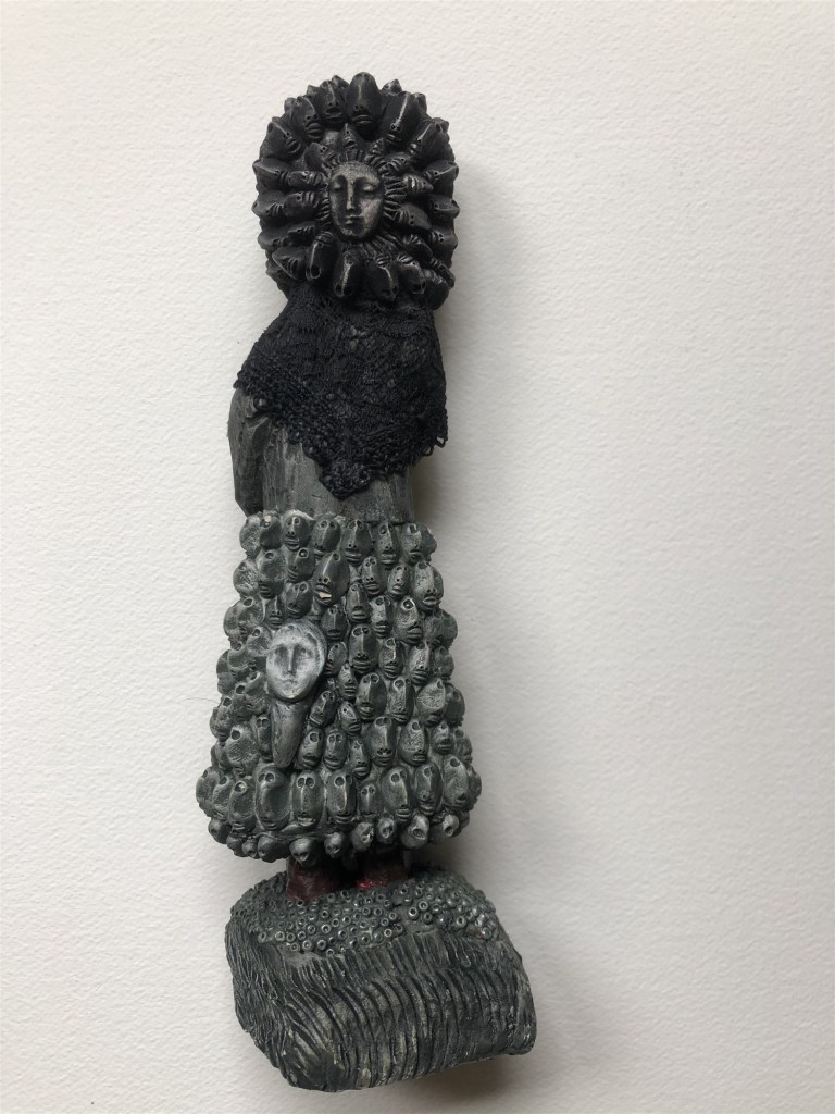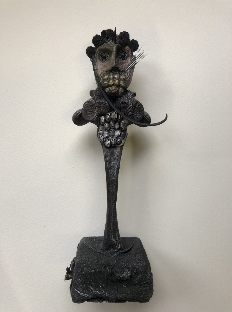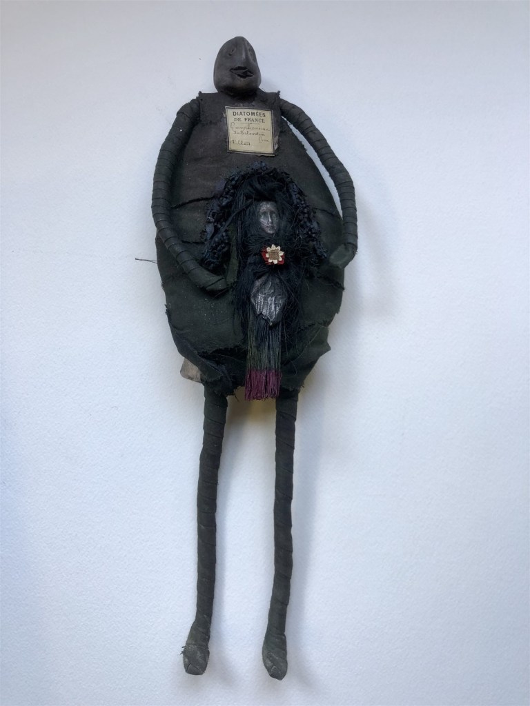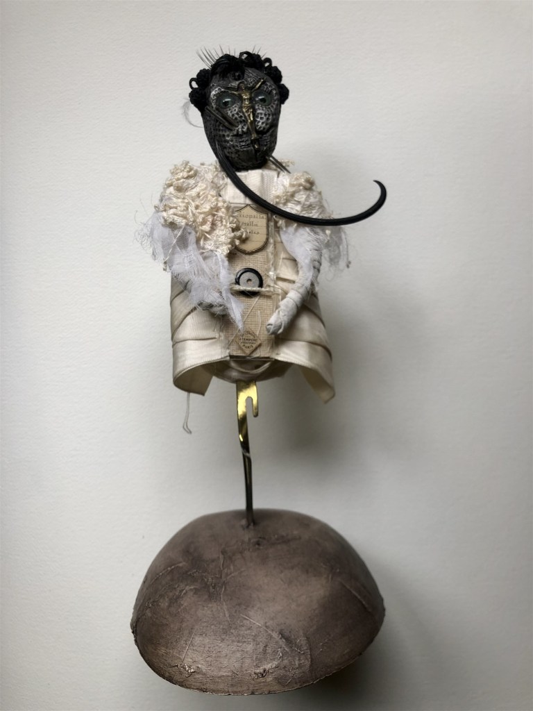 POUPÉE N°569 – Tissus – Céramique – Aiguilles – Perles Vertèbre – Os – Socle. 23 cm x 6 cm.