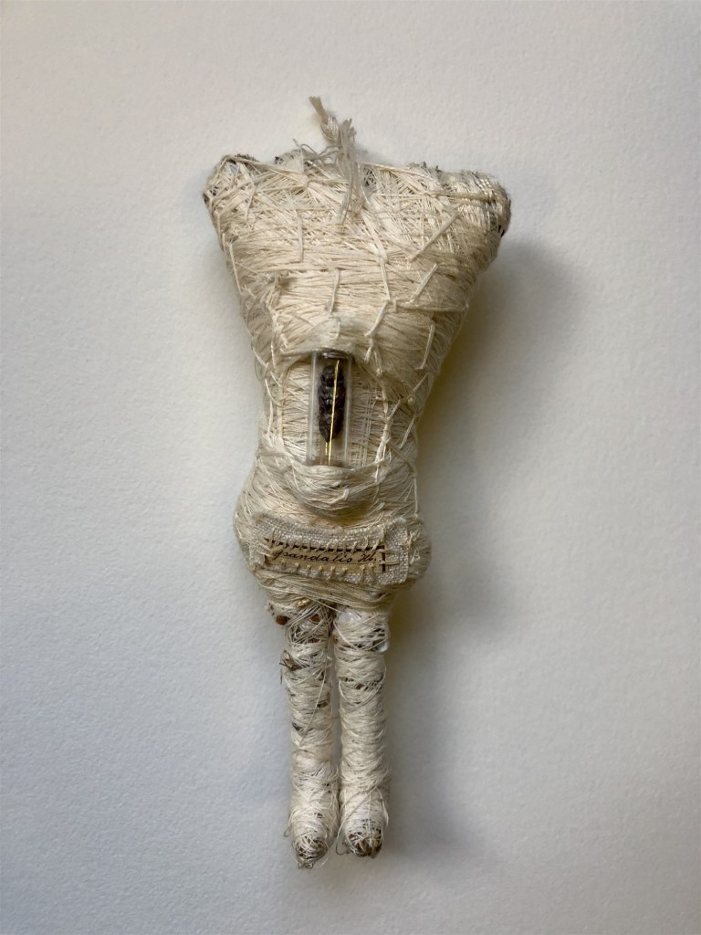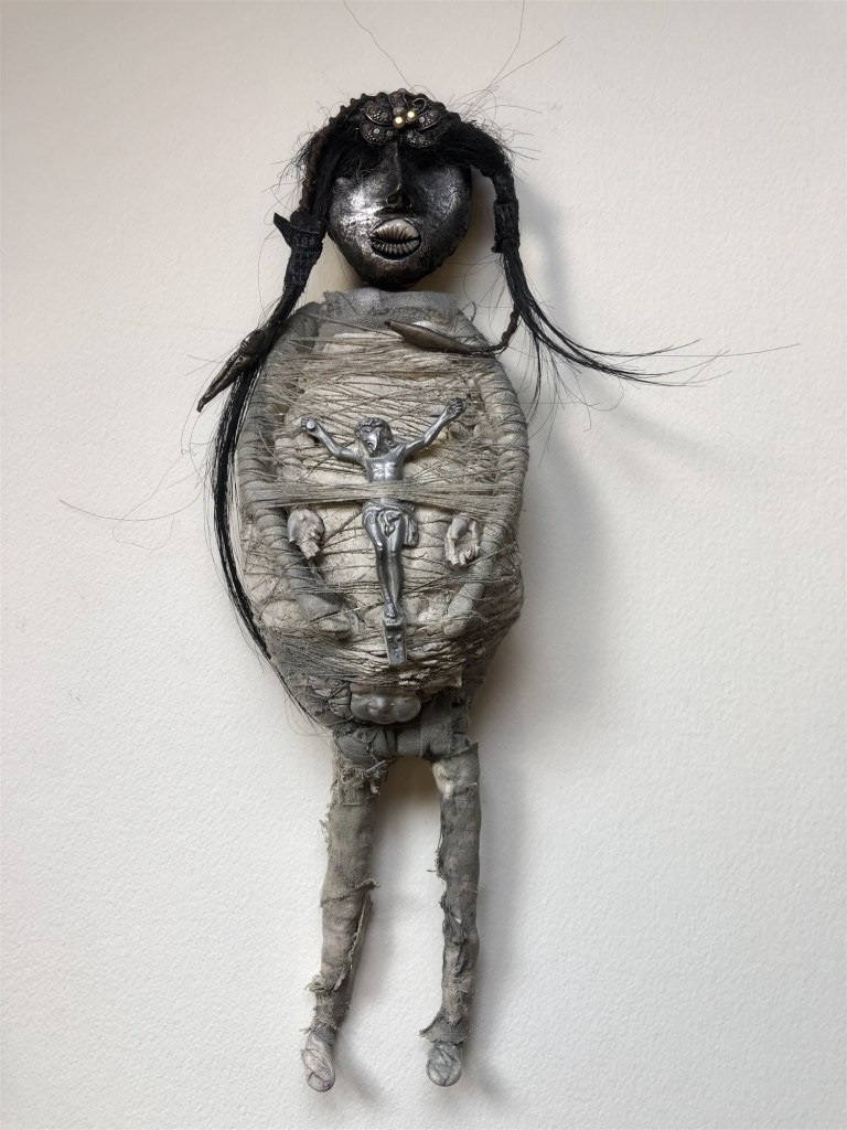 POUPÉE N°574 – Tissus – Vertèbre – Céramique – Aiguilles – Christ. 20 cm x 15 cm.
