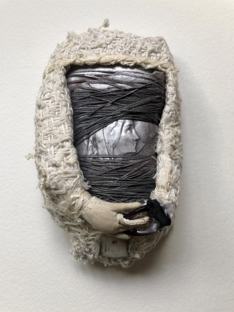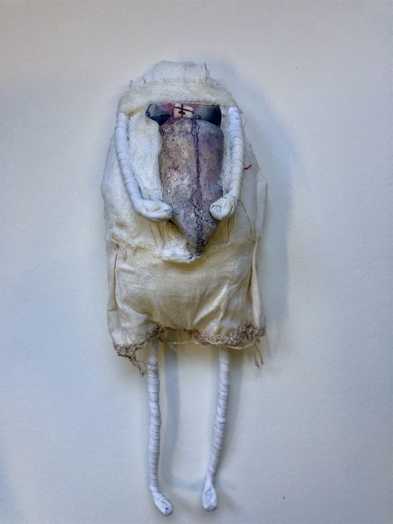 POUPÉE N°565 – Tissus – Céramique – Aiguille – Fils de soie rouge – Médailles – Bande Velpeau. 14 cm x 10 cm.