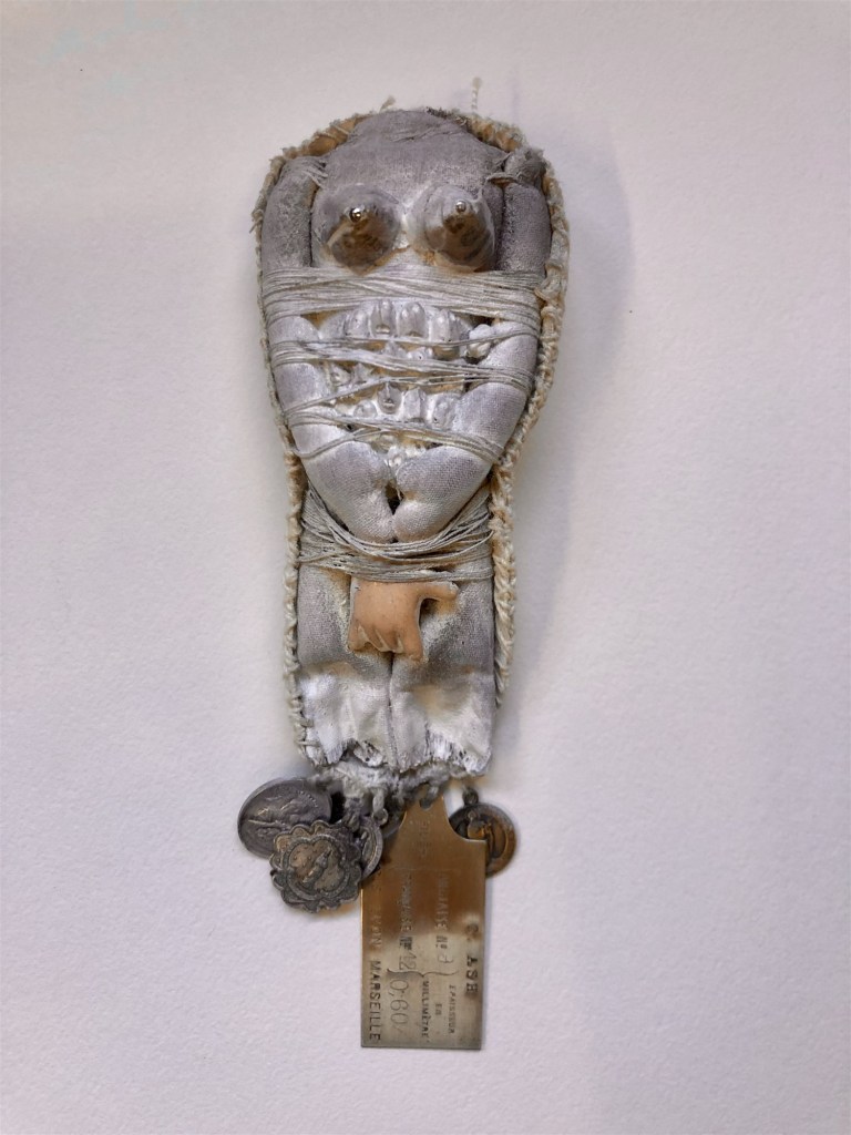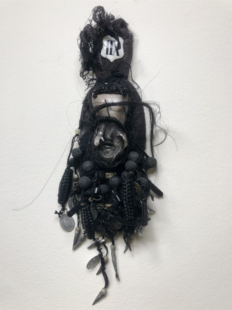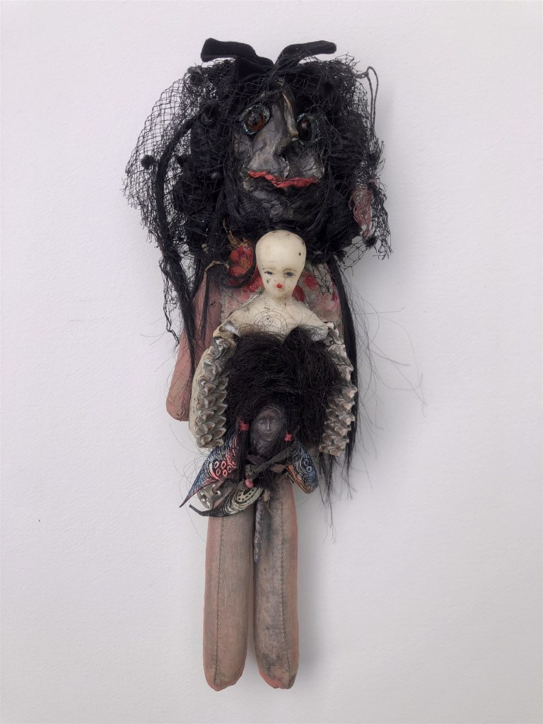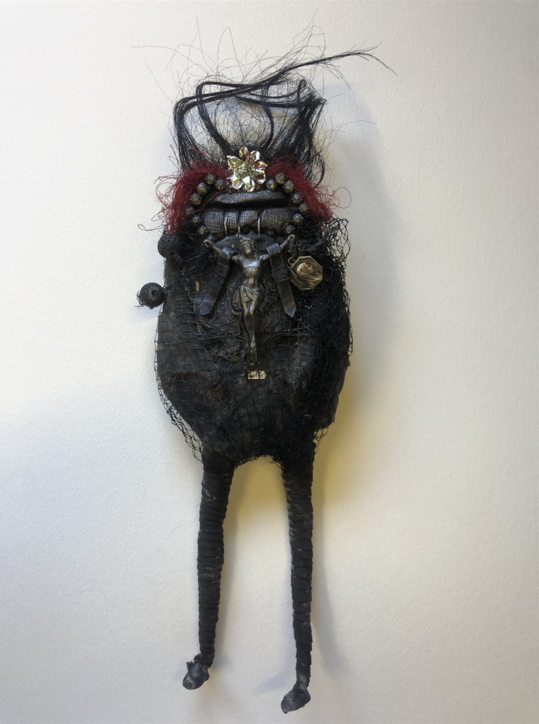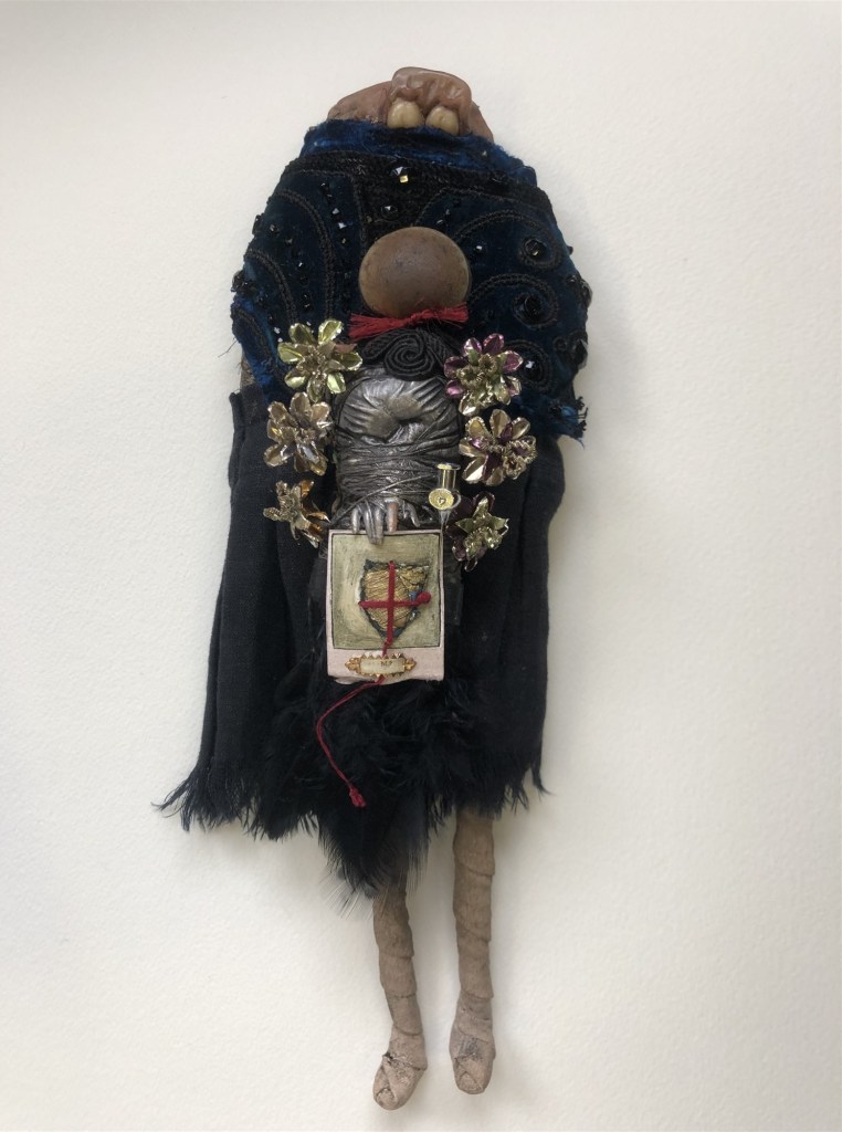 POUPÉE N°559 – Poupée reliquaire – Tissus – Étoffe ayant touché le dernier des rois Pessinois – Céramique – Fleurs – Dentier – Aiguille Plumes. 28 cm x 9 cm.