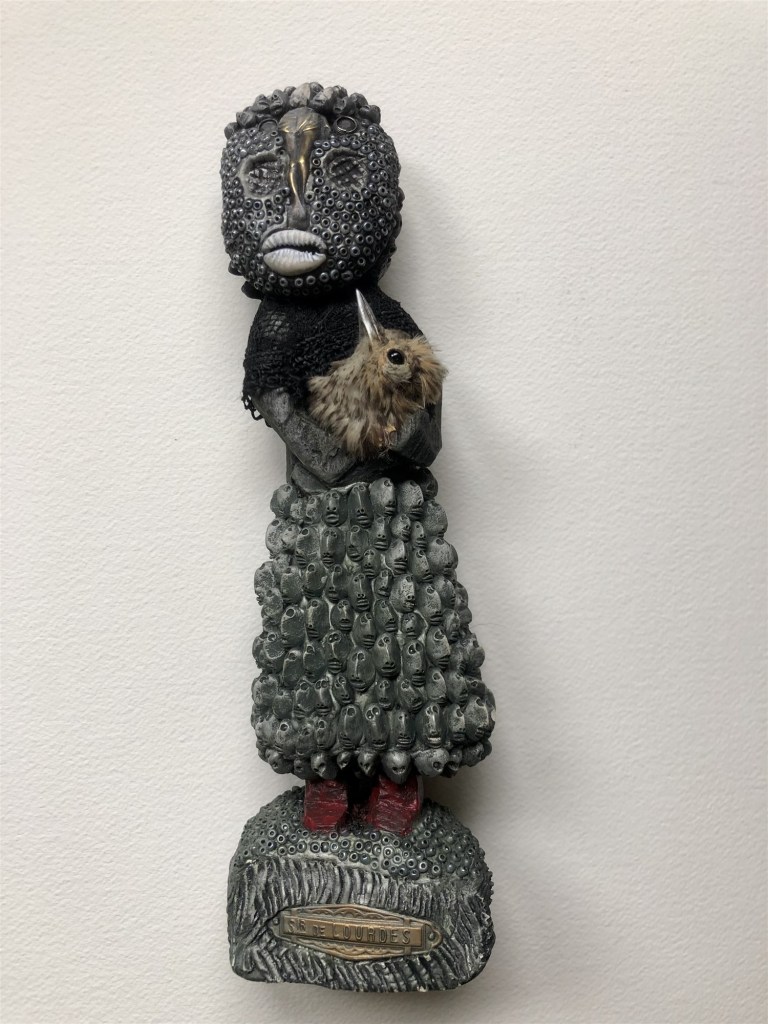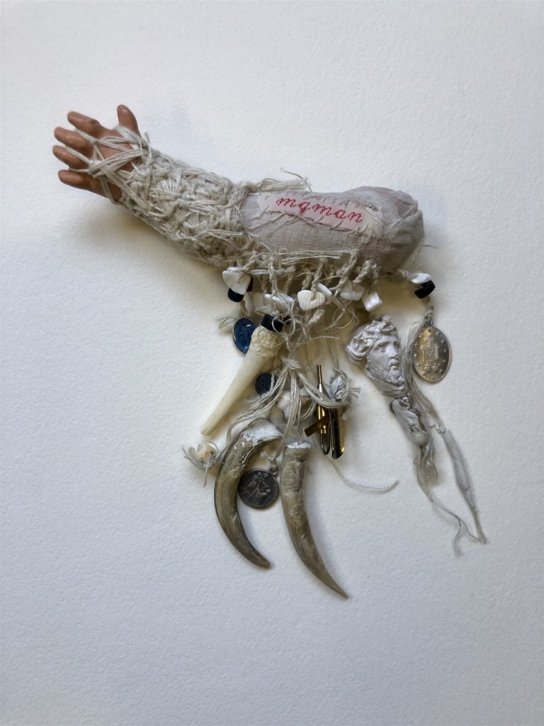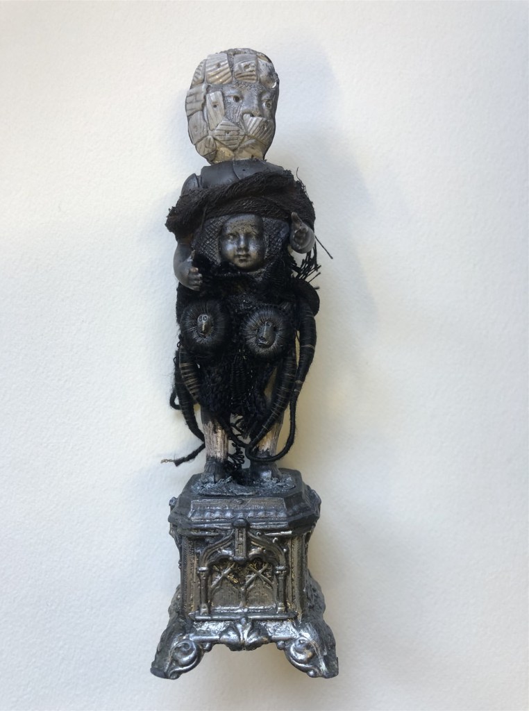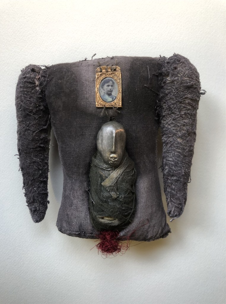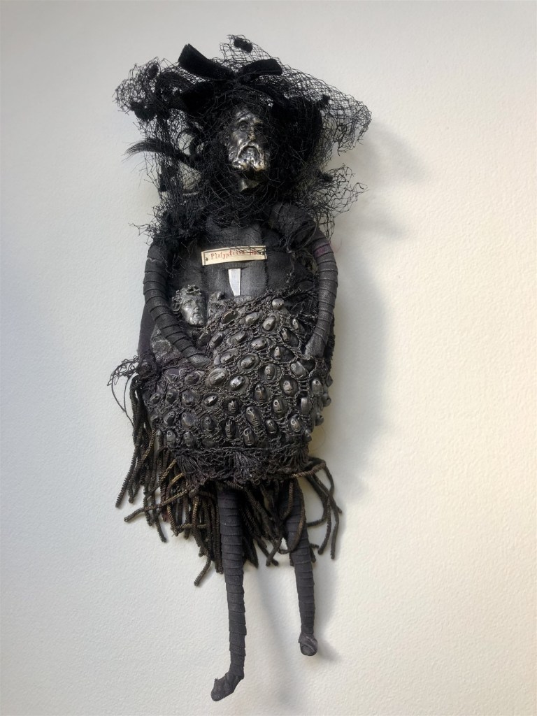 POUPÉE N°559 – Poupée reliquaire – Tissus – Étoffe ayant touché le dernier des rois Pessinois – Céramique – Fleurs – Dentier – Aiguille Plumes. 28 cm x 9 cm.