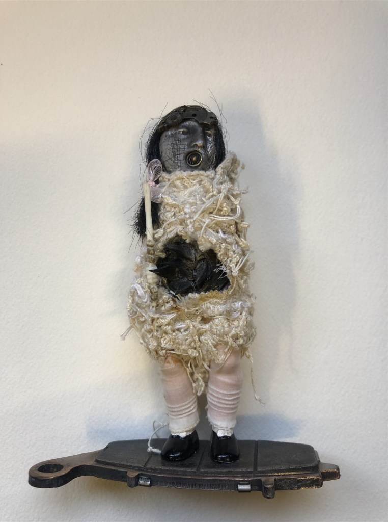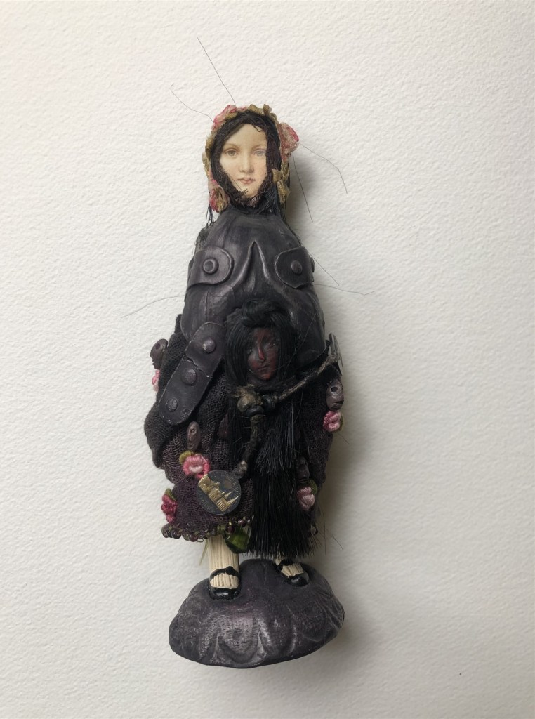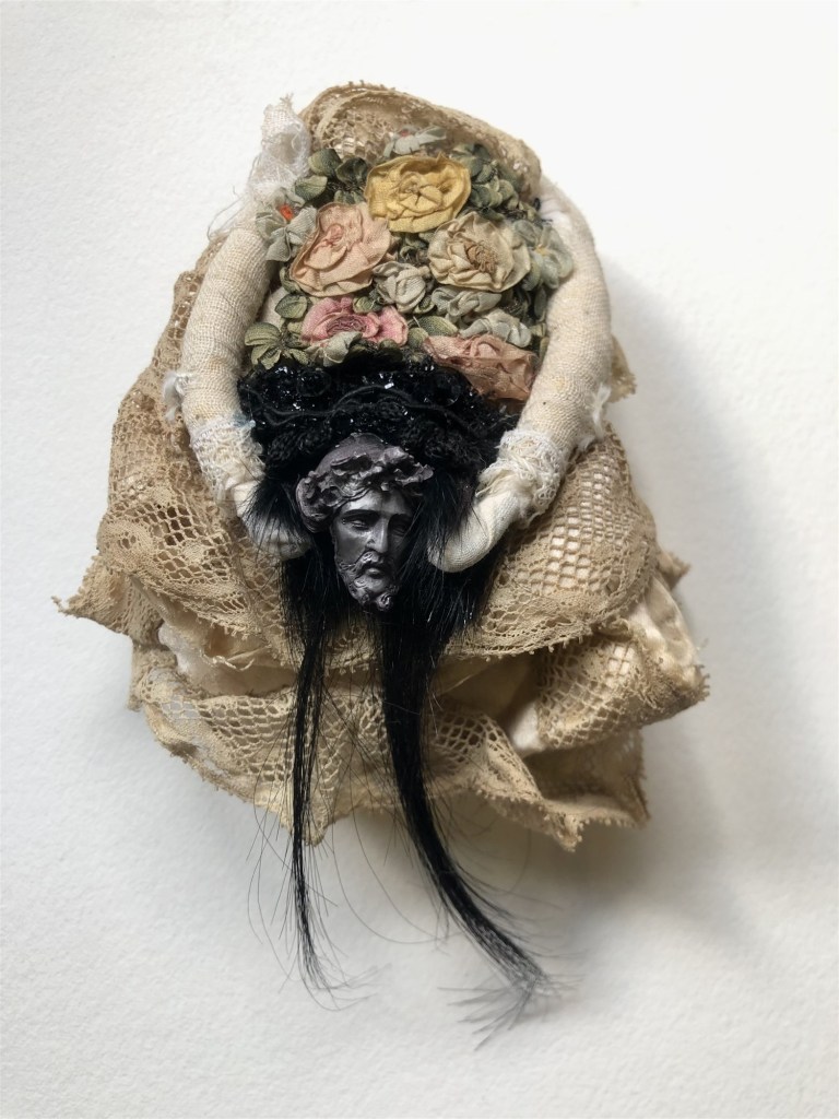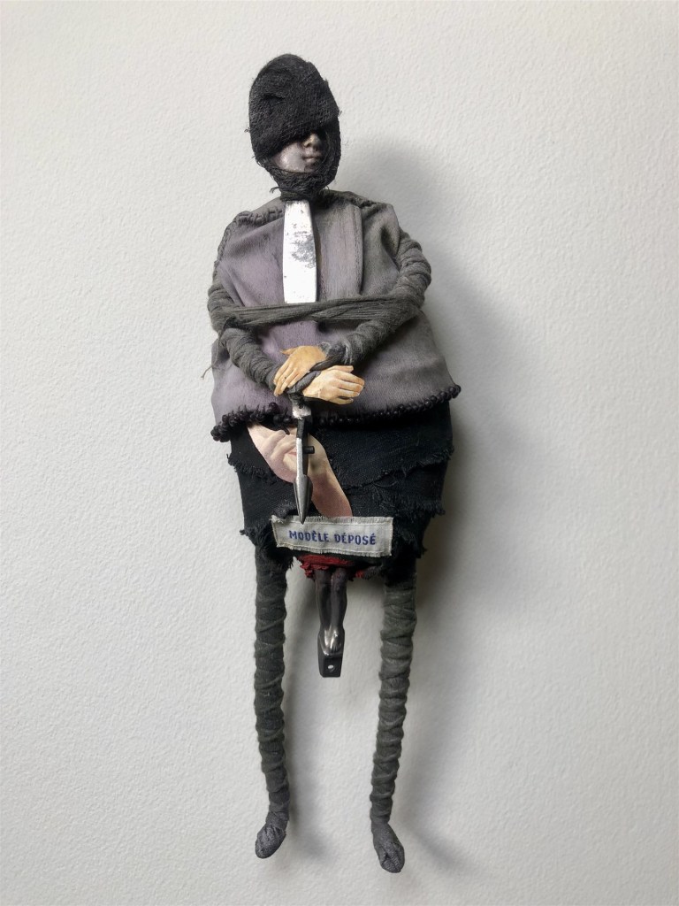 POUPÉE N°581. Tissus – Céramique – Rouage de montre – Cole en fer. 14 cm x 11 cm.