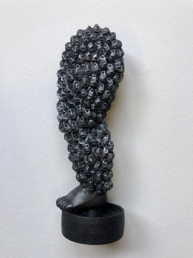 POUPÉE N°512 – Jambe de poupée recouverte de petites têtes – Socle en fer. 15 cm X 5 cm.