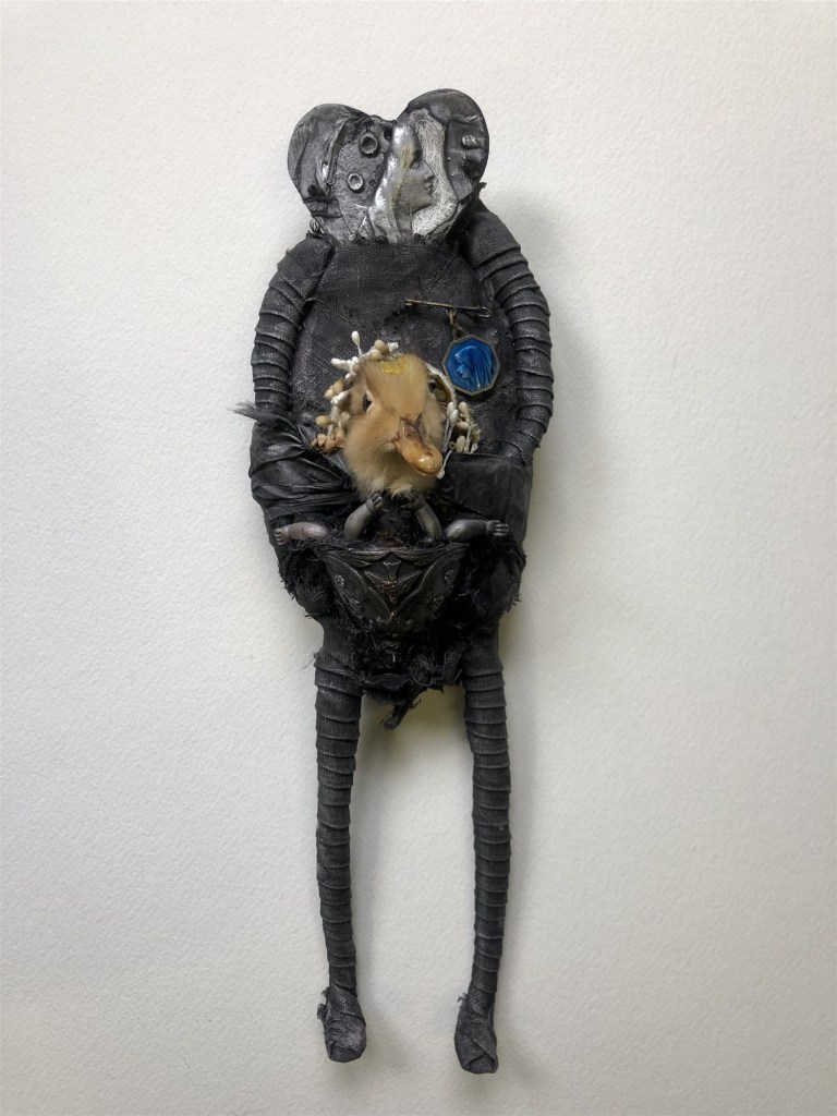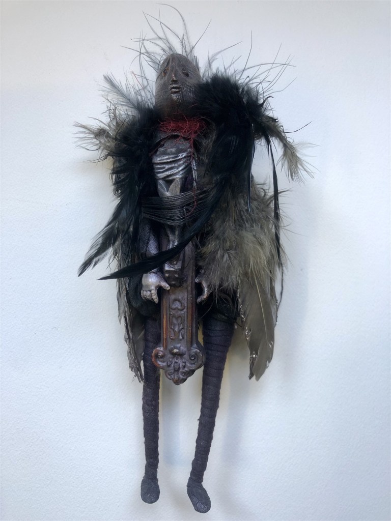 POUPÉE N°514 – Tissus – Céramique – Tête d’oiseau. 24 cm X 8 cm.
