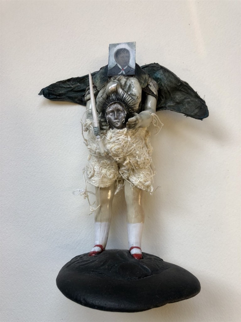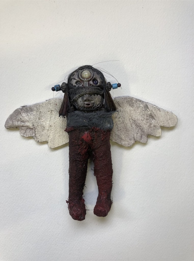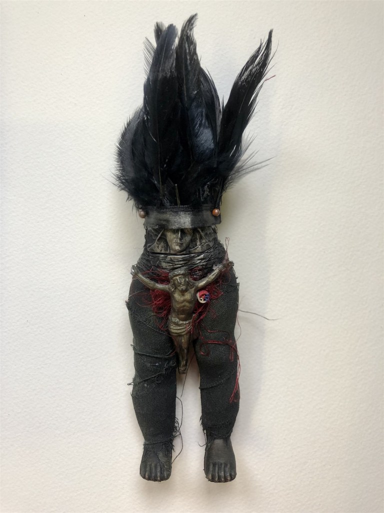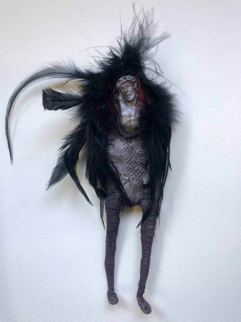 POUPÉE N°549 – Tissus – Céramique – Plumes – Christ – Fil de soie rouge. 21 cm x 5 cm.