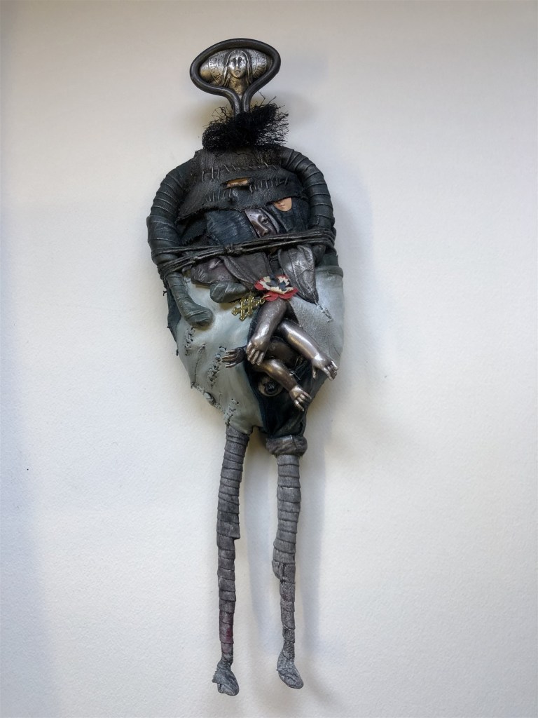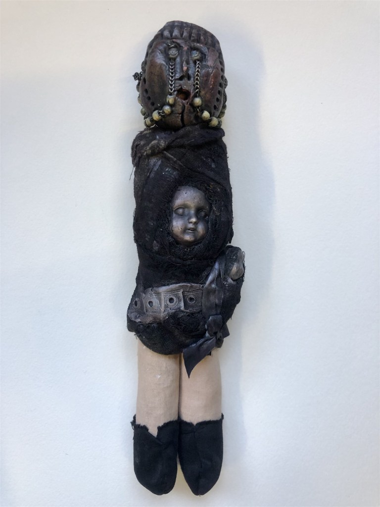 POUPÉE N°518 – Tissus – Céramique – Vrillette – Cuir. 34cm X 10 cm .