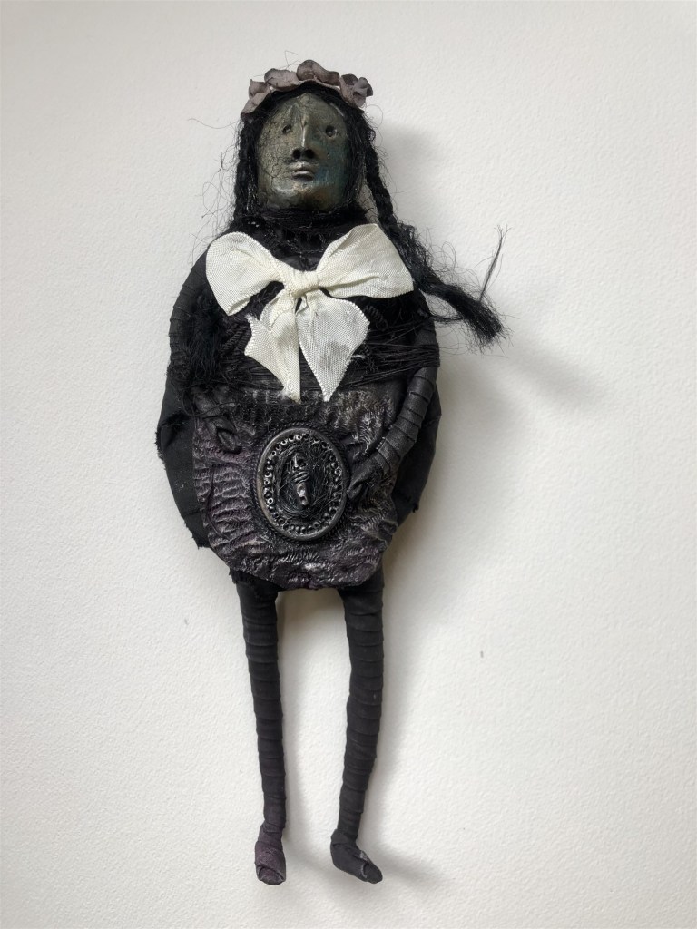 POUPÉE N°534 – Tissus – Céramique – Broderie – Collier perles noir – Croix bois. 30 cm X 10 cm.