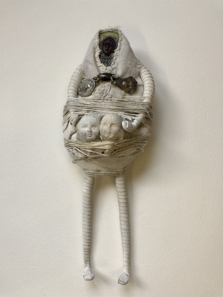 POUPÉE N°539 – Tissus – Céramique – Médailles – Ficelle. 25cm x 9 cm.