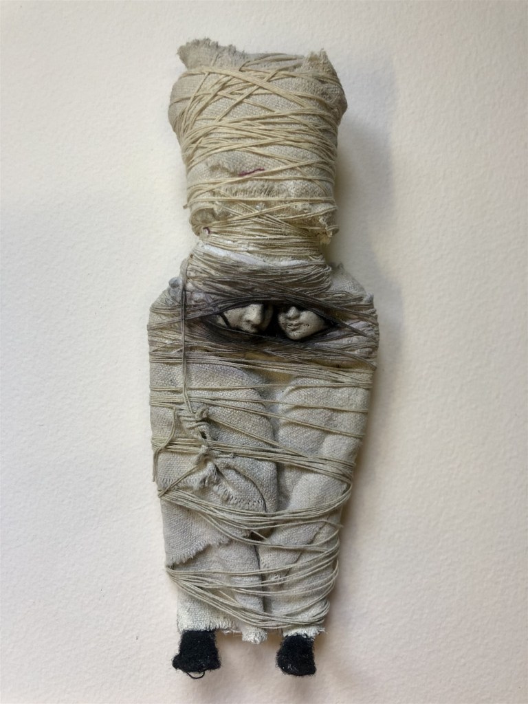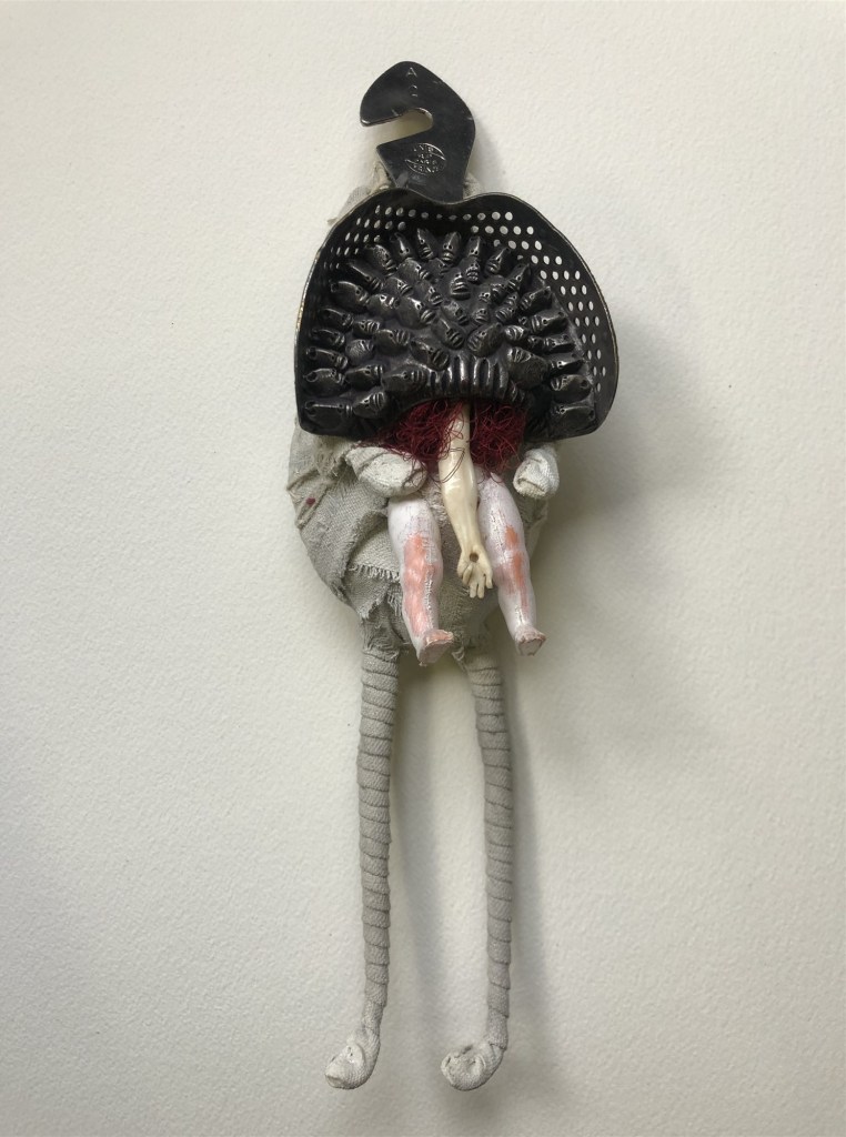 POUPÉE N°542 – Tissus – Moulé dentaire – Céramique – Fil de soie rouge. 25 cm x 7 cm.