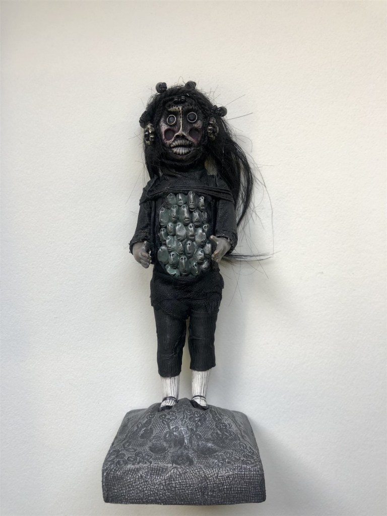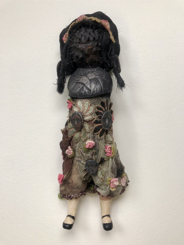 POUPÉE N°511 – Tissus – Cuir – Céramique – Broderie. 21 cm X 7 cm.