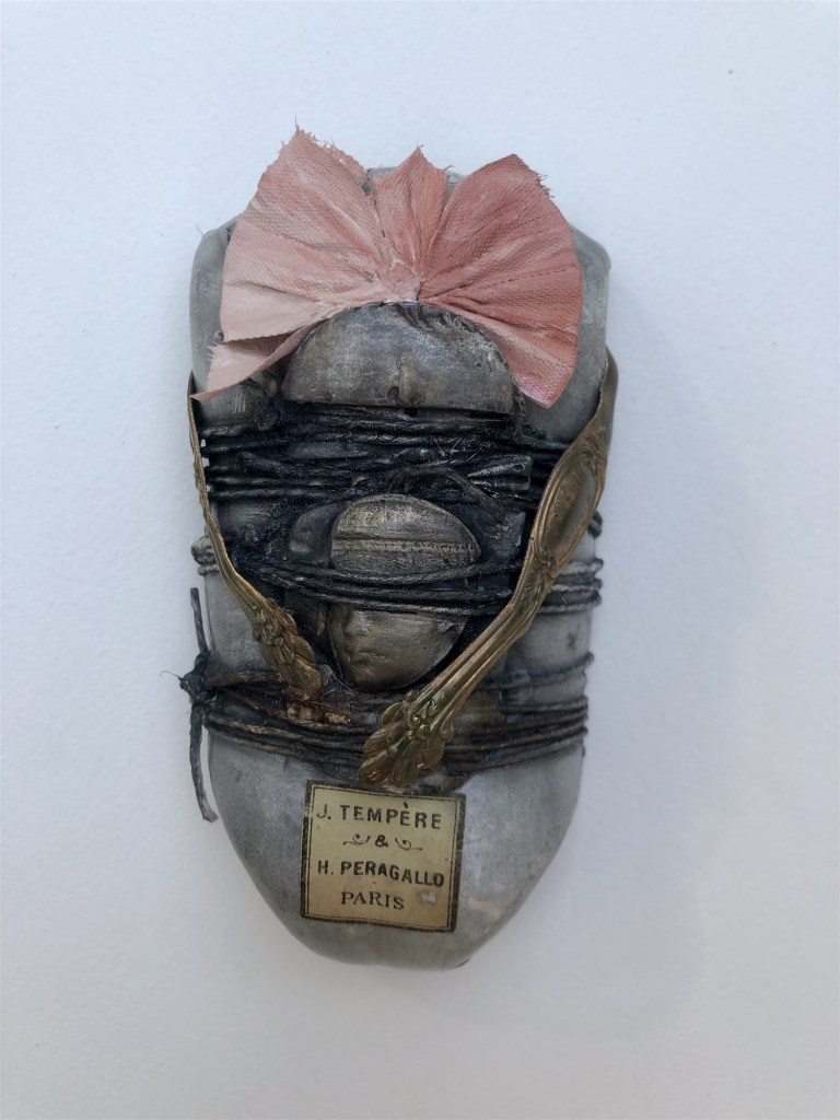POUPÉE N°585 – Tissus – Céramique – Plumes – Aiguille – Fils de soie rouge – Socle en métal. 20 cm x 13 cm.
