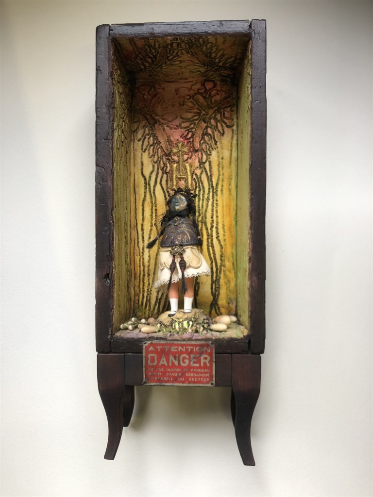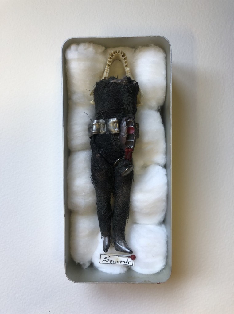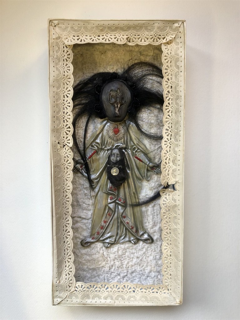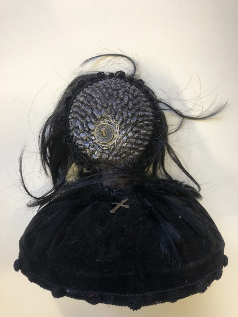 POUPÉE N°578 – Boîte – Céramique – Aiguilles – Cheveux – Perles – Crâne – Médaille – Broderie. 30 cm x 14 cm.