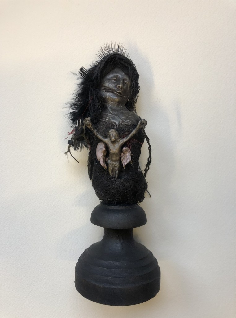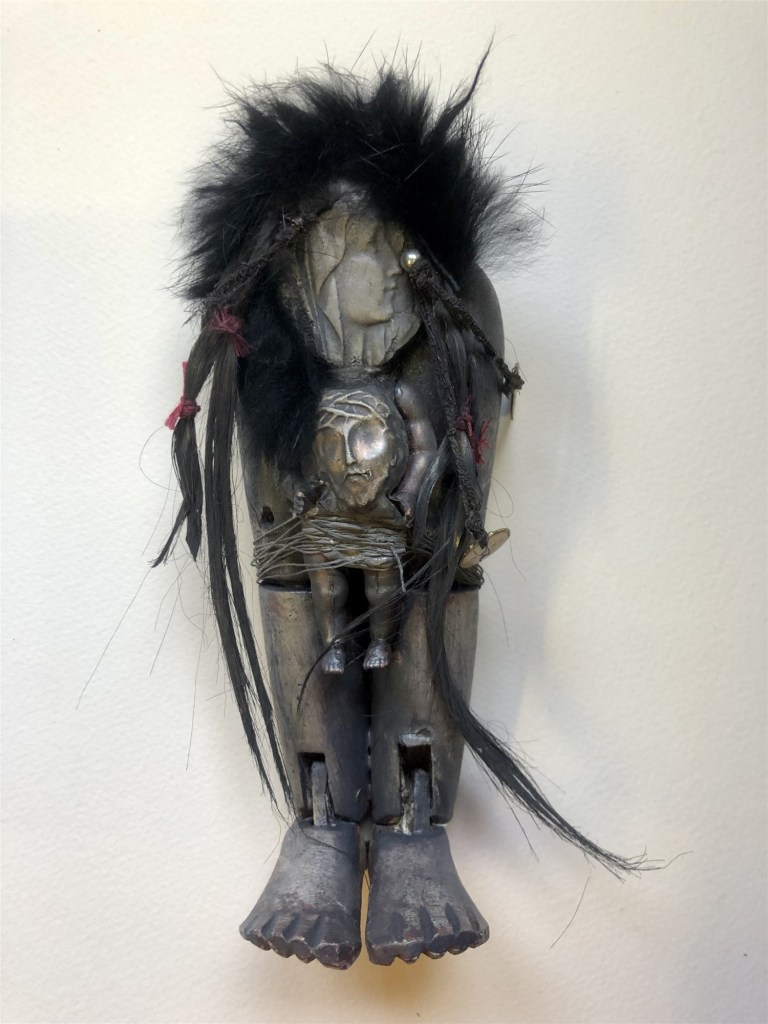 POUPÉE N°582. Tissus – Céramique – Cheveux – Plumes – Christ – Socle. 18 cm x 7 cm.