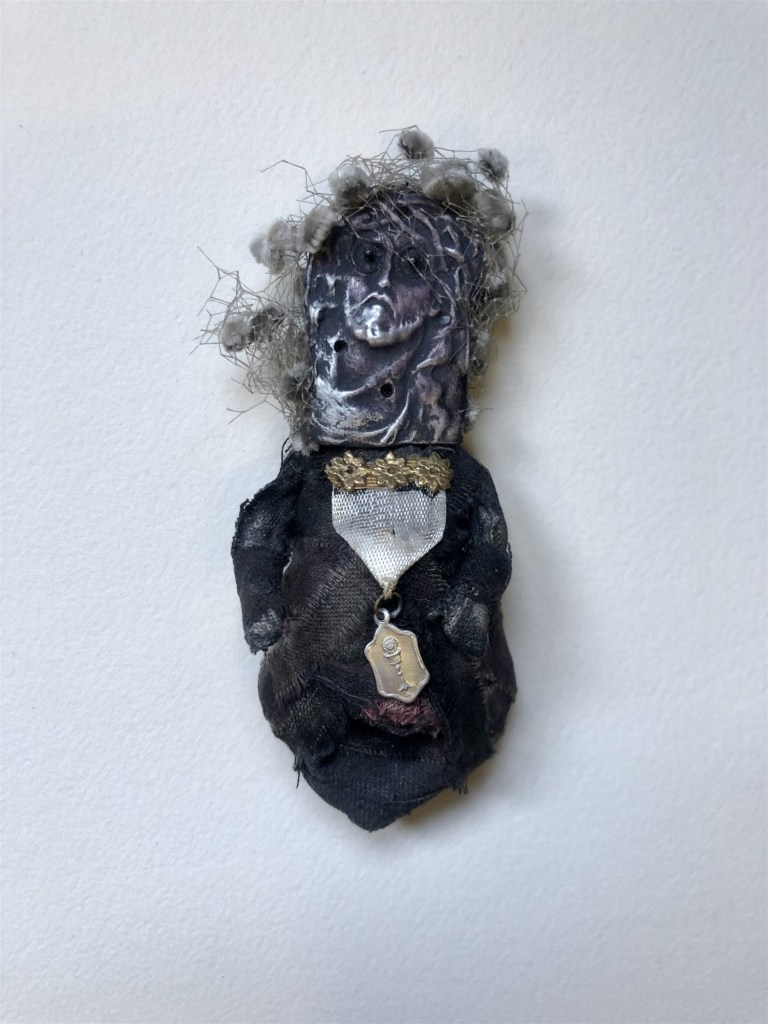 POUPÉE N°593 – Tissus – Céramique – Médailles – Broderie. 15 cm x 6 cm.