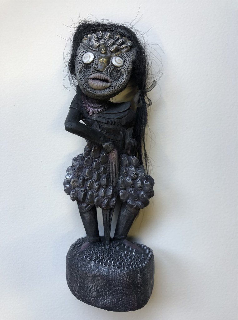 POUPÉE N°535 – Tissus – Céramique – Coquillage – Cheveux. 15 cm x 6 cm.